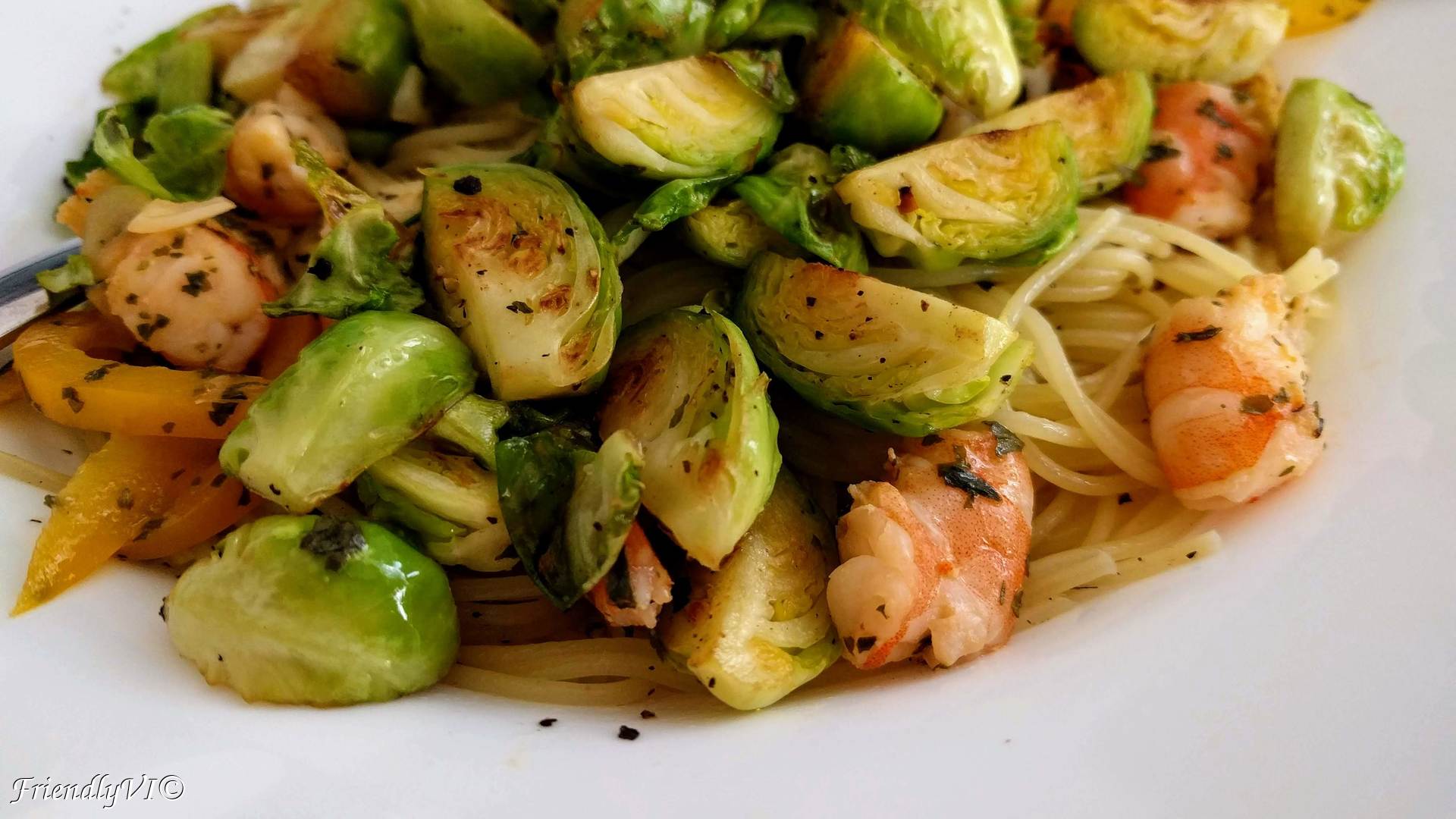 Long story short, start frying the sprouts cut in half with the belly down in a cold pan. Add 3-4 tbsps of olive oil and cover it for 5 min with a pan and then cook without the pan for 3 more min. They will be golden and sweet and an amazing vegetable from now on. Now all you need to do is to warm up the boiled shrimps (I buy them boiled already and clean the shell). Mix it with your favorite pasta and season with lemon juice, parsley and pepper.