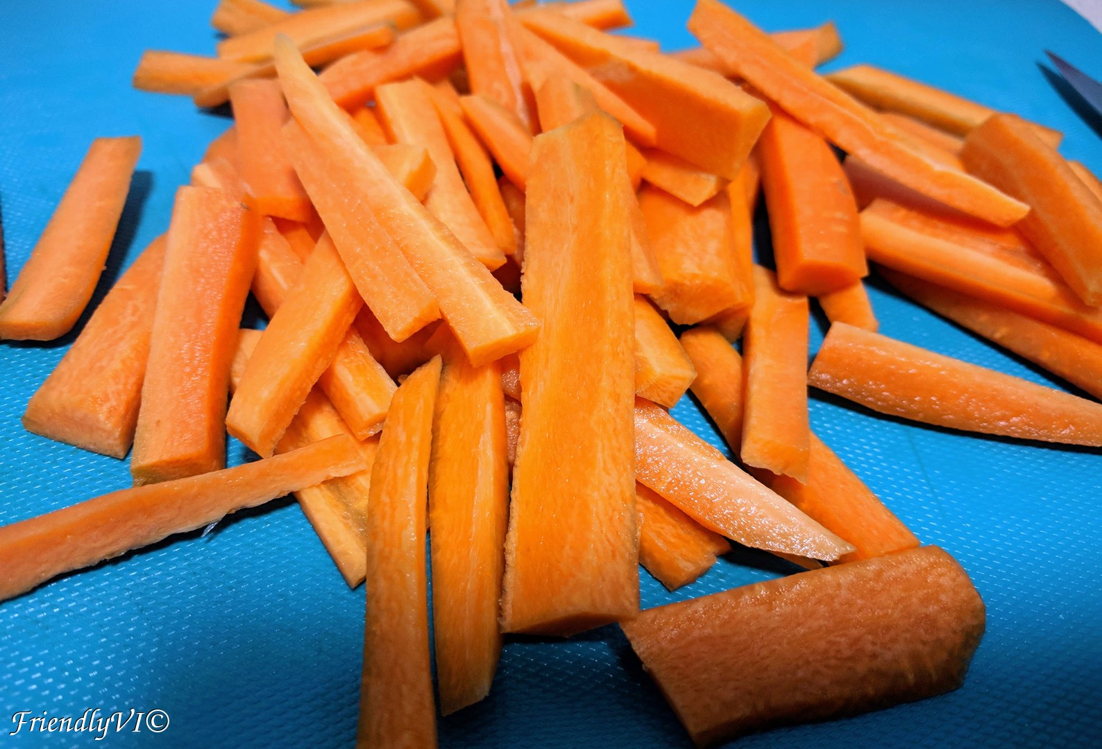 All you need to do is to cut the carrots in whatever shape is the easiest for you, add some salt and pepper to taste, thyme and spicy paprika and sprinkle a bit of olive oil. Bake them at 185 ºC for 15 min and they are ready to be devoured warm and even cold.