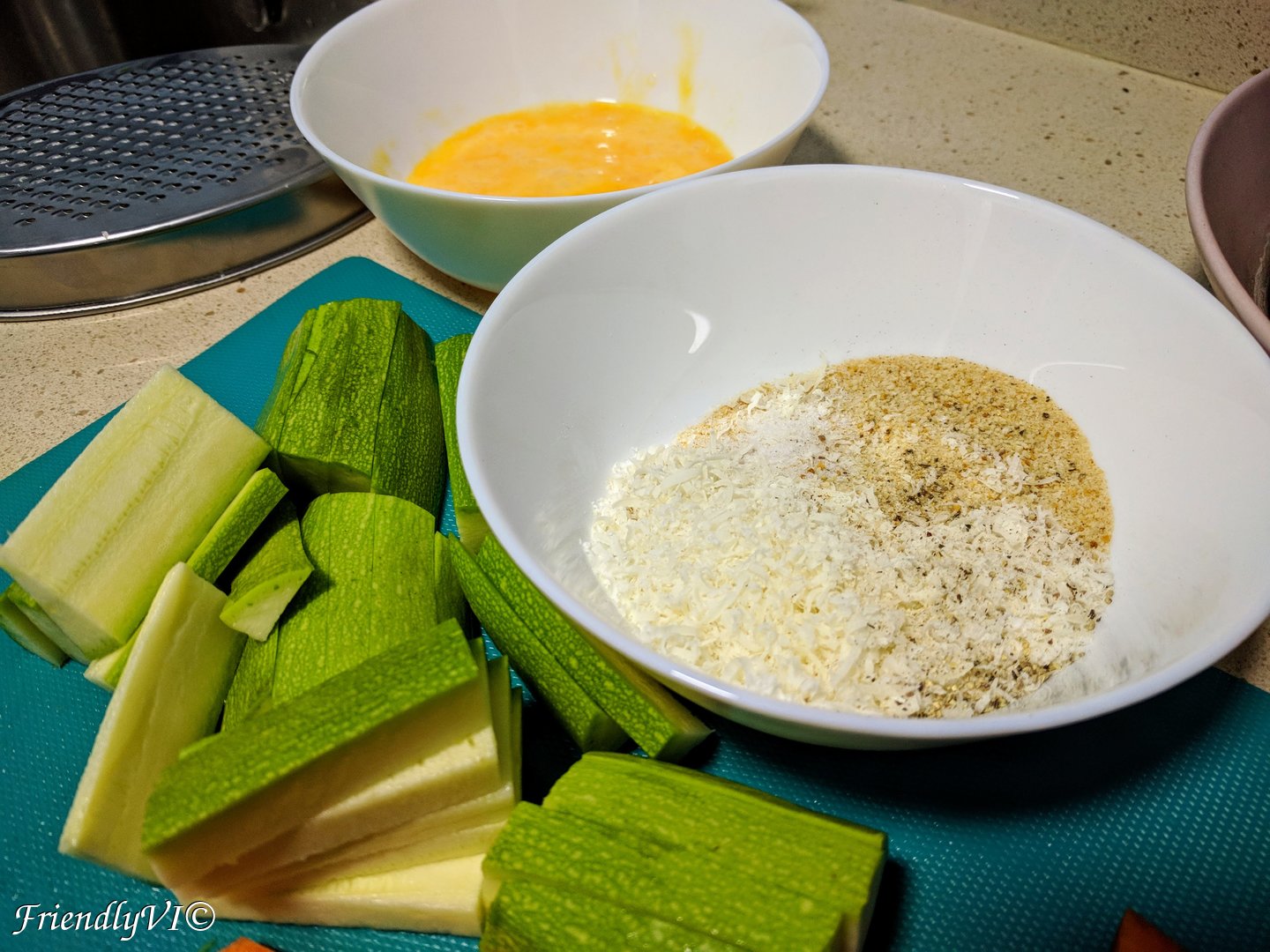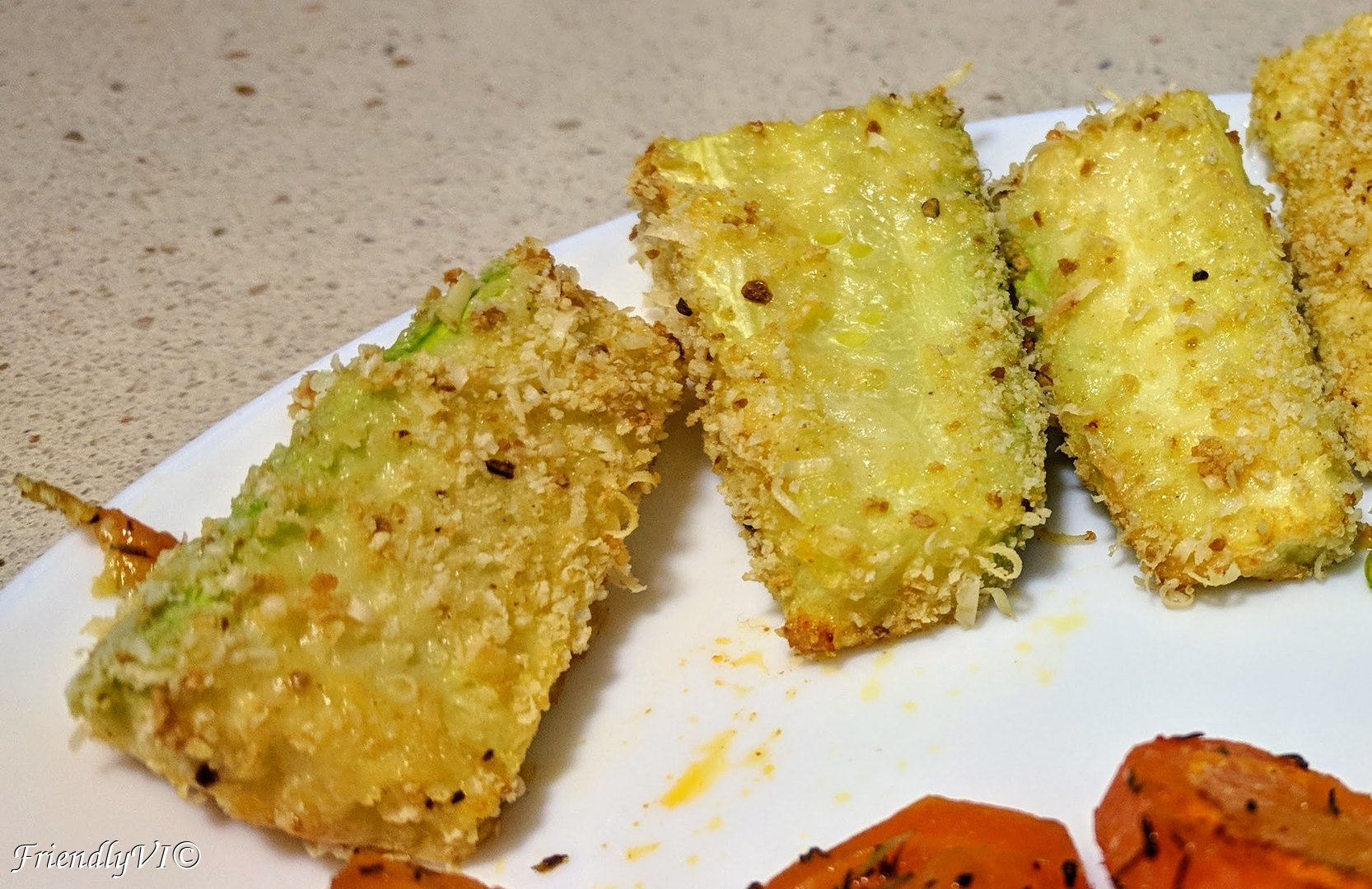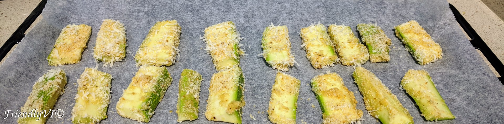 Cut one zucchini as in the picture. Mix 3 tbsp of bread crumbs with grated Parmesan, salt and pepper. Roll the zucchini in a beaten egg and afterwards cover it in the bread crumbs mix. Bake them at 185 ºC for 15-20 min.