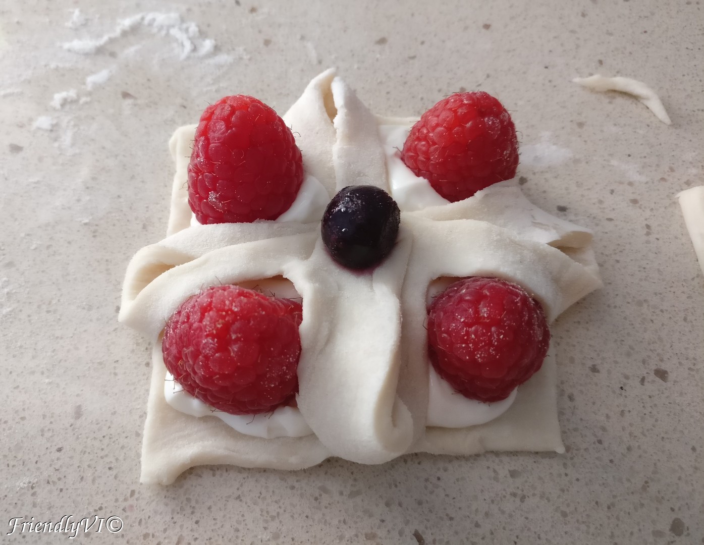 Cut a square from your pastry and a smaller square into it, leaving the middle of each line uncut. Add in the middle some cream cheese mixed with sugar and 4 raspberries. Fold each corner over the raspberries and connect it in the middle. You can add another raspberry or blueberry in the middle. Bake it at 200 C for 15 min.