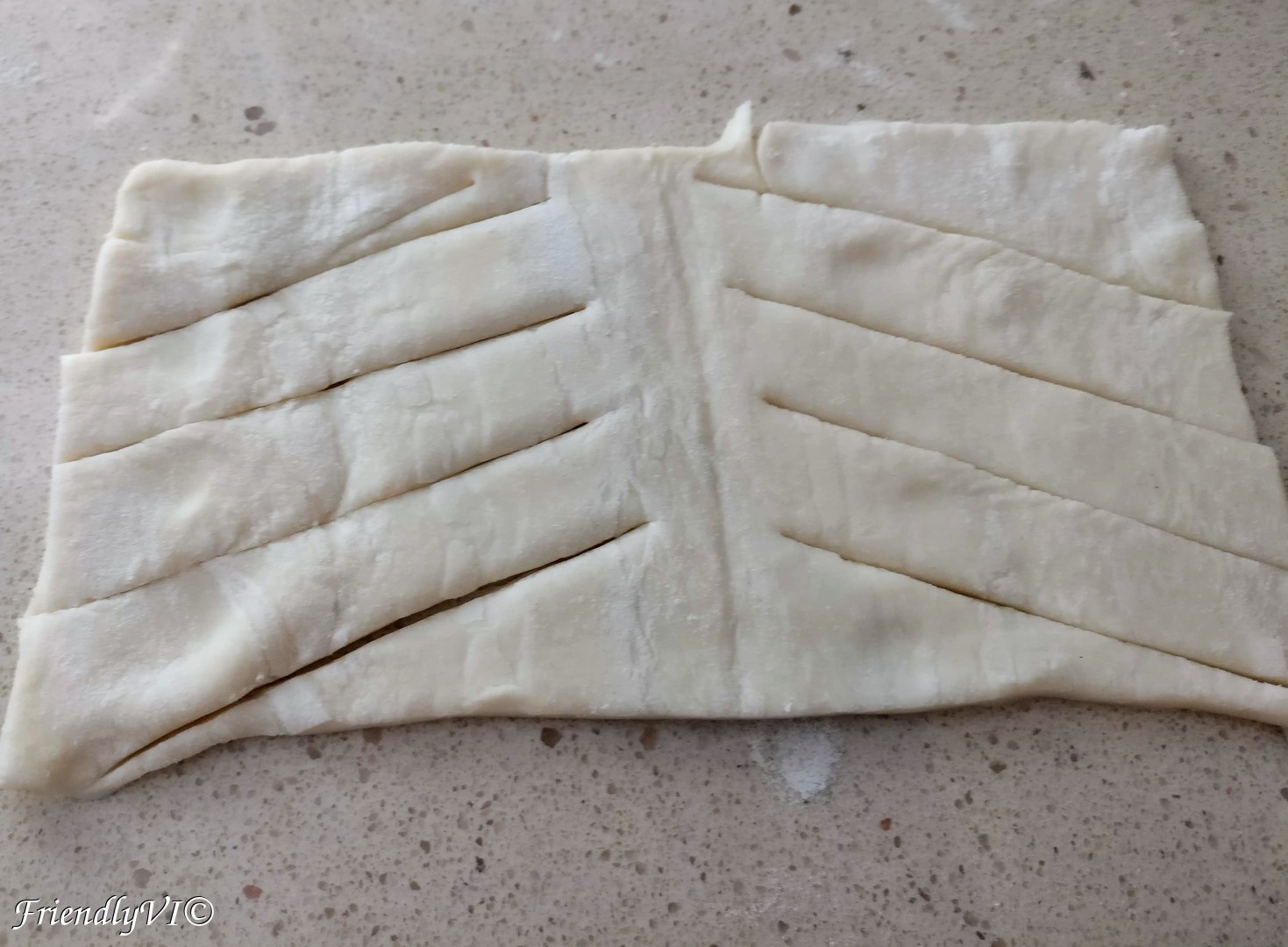 Cut a square from your pastry fold it into a triangle. Cut a smaller triangle like in the picture, but leave the top of it uncut (where I hold my finger). Open it up and fold the cut lines onto each other. Add in the middle some cream cheese mixed with sugar and half a strawberry and bake it at 200 C for 15 min.