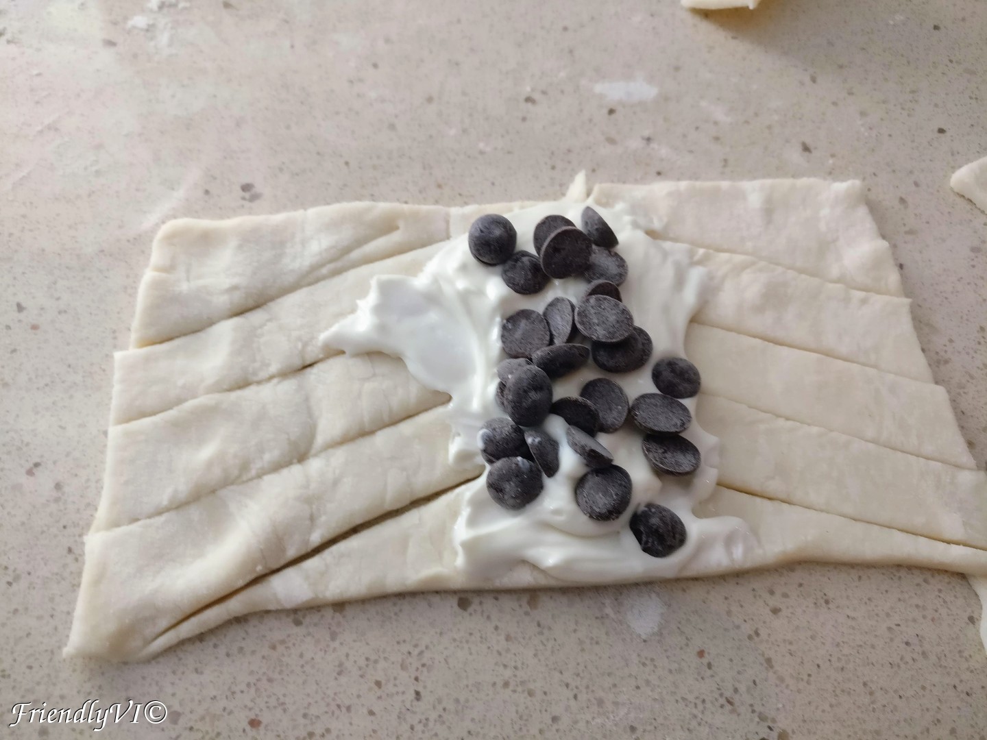 Cut a rectangle from your pastry and cut in diagonals, leaving the middle uncut. Add in the middle some cream cheese mixed with sugar and chocolate chips or apricots. Fold like in a braid the cut edges one after the other, making sure you close it well at the top and bottom. Bake it at 200 C for 15 min.