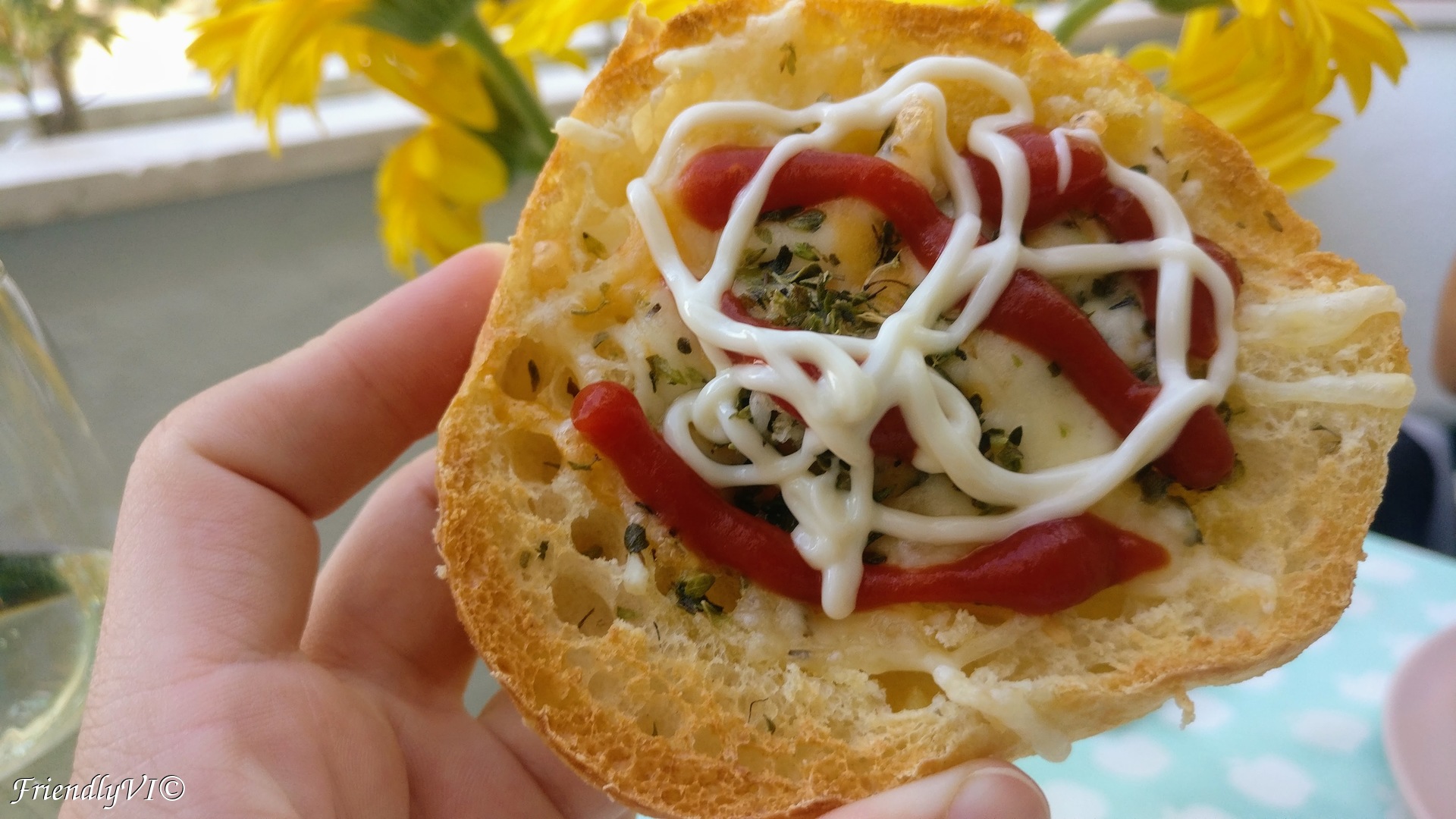 Start to toast the bread in the oven with the grill function. Once it has a bit of color, take it out of the oven, add a tiny bit of butter, grated cheese, dried oregano, dried basil, in this exact order. Put it back in the oven until the cheese is melted. Top with mayo and ketchup and it is done: