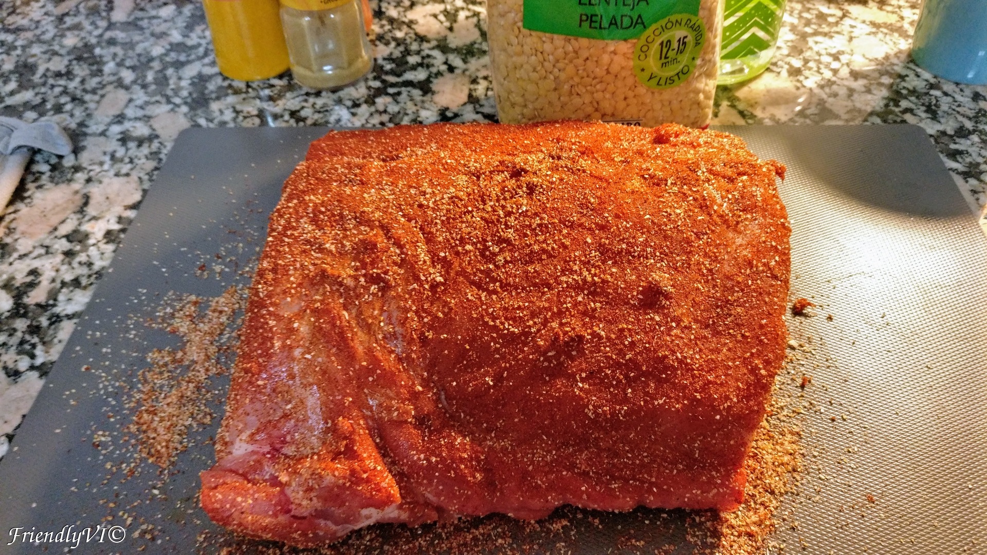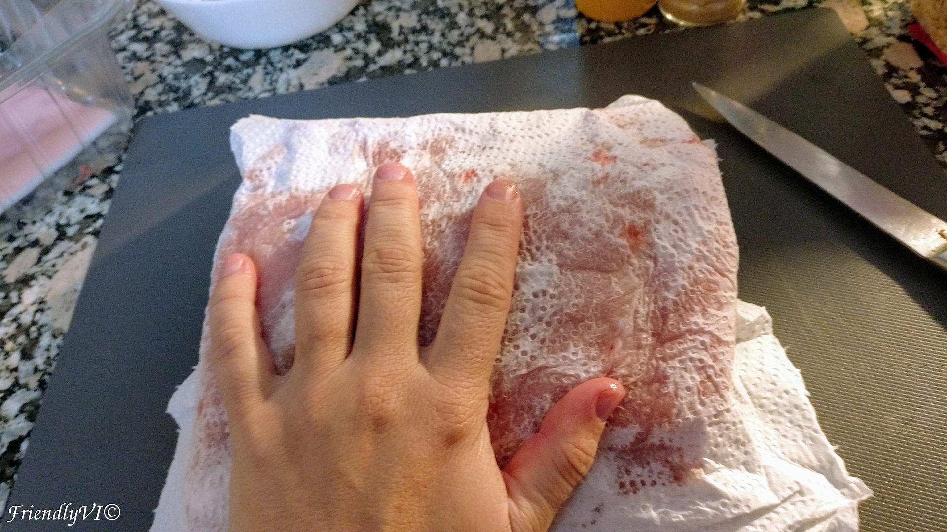 Tap dry one big piece of pork tenderloin. In the meantime, place a cast iron skillet in the oven at 230 C for 10 min.