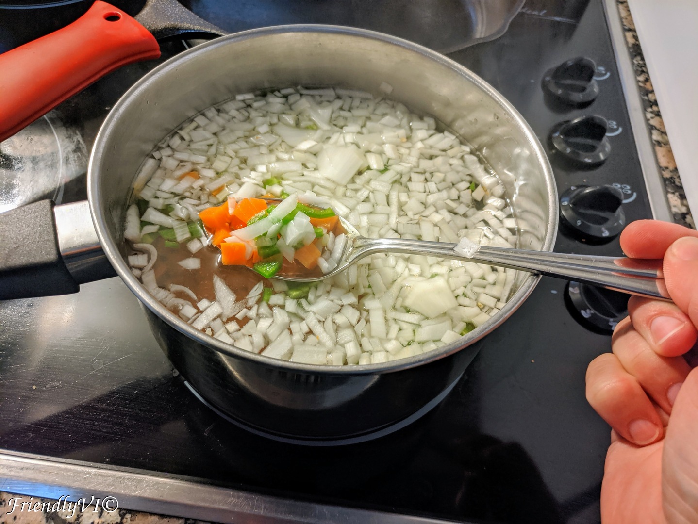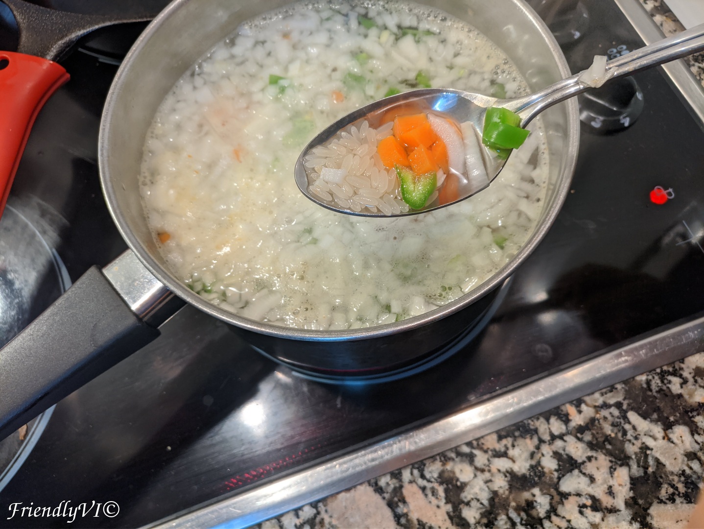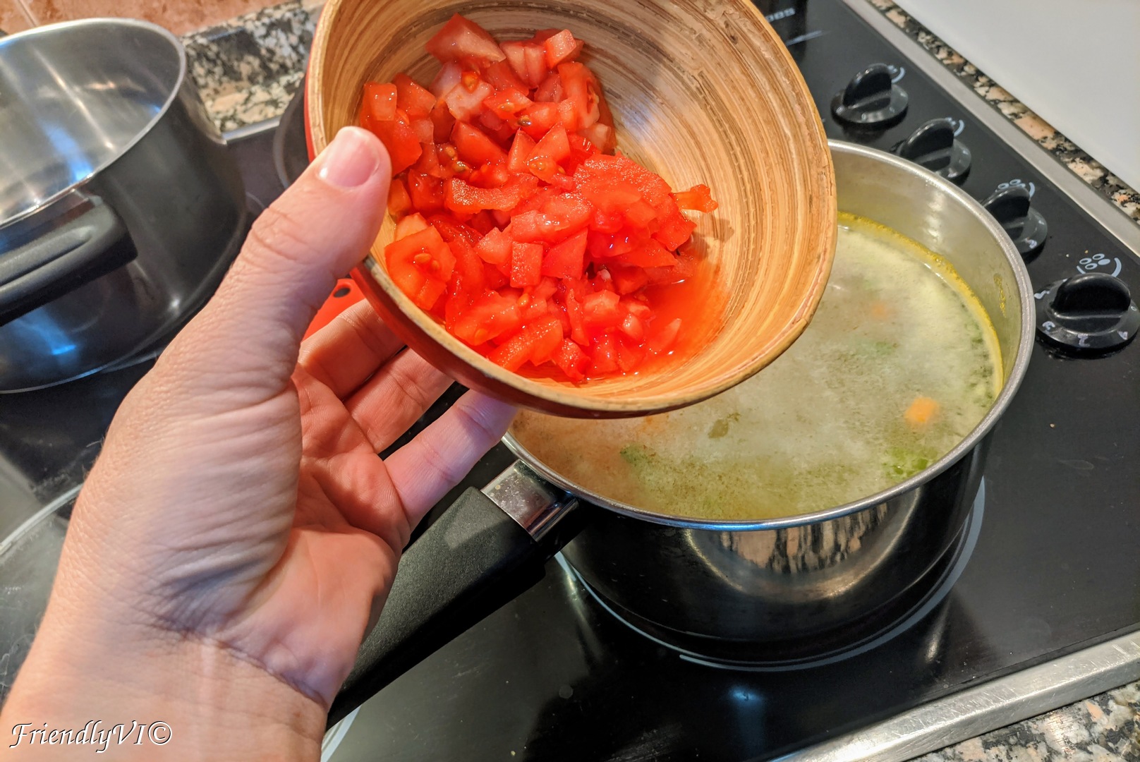 In a pot with water put 1 diced onion, 1-2 diced stalks of celery, 1-2 diced carrots. Bring it to a boil and let it simmer until it is almost fully cooked. Now add 4-5 tbsp of washed rice and boil it 5 min before its cooking point. Add this point you can add salt to taste and 2-3 tbsp of tomato paste or 1-2 chopped tomatoes.