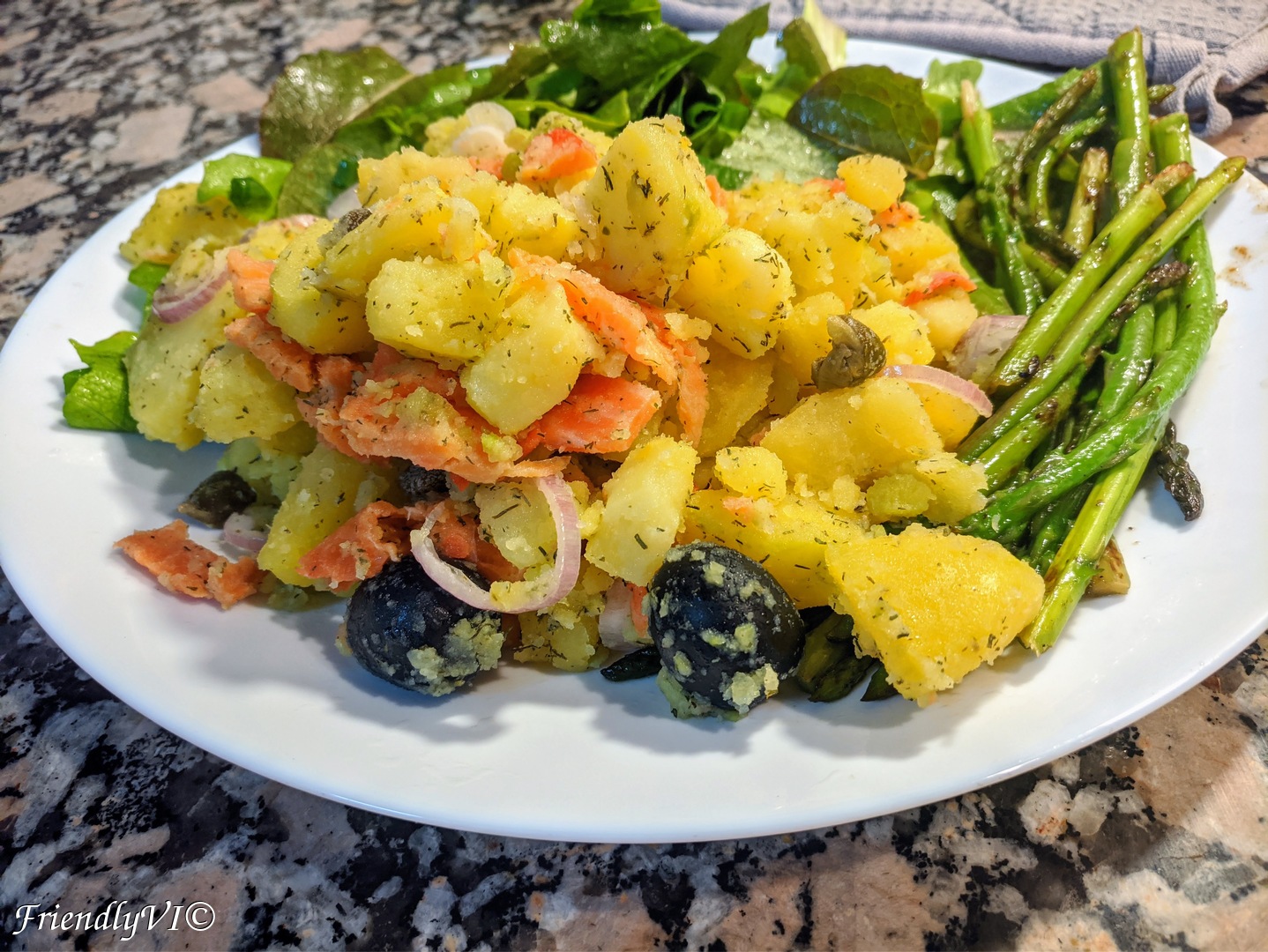 Boil the potatoes in the skin. Peal them while still hot, cut them into cubes and season them with salt, pepper, olive oil and vinegar to taste. It is best to season them hot, since potatoes can absorb and retain better he flavors. Add the smoked fish of your choice, chopped into small pieces. The rest of ingredients are: shallots to taste, capers, black olives and dill.