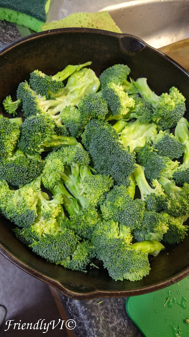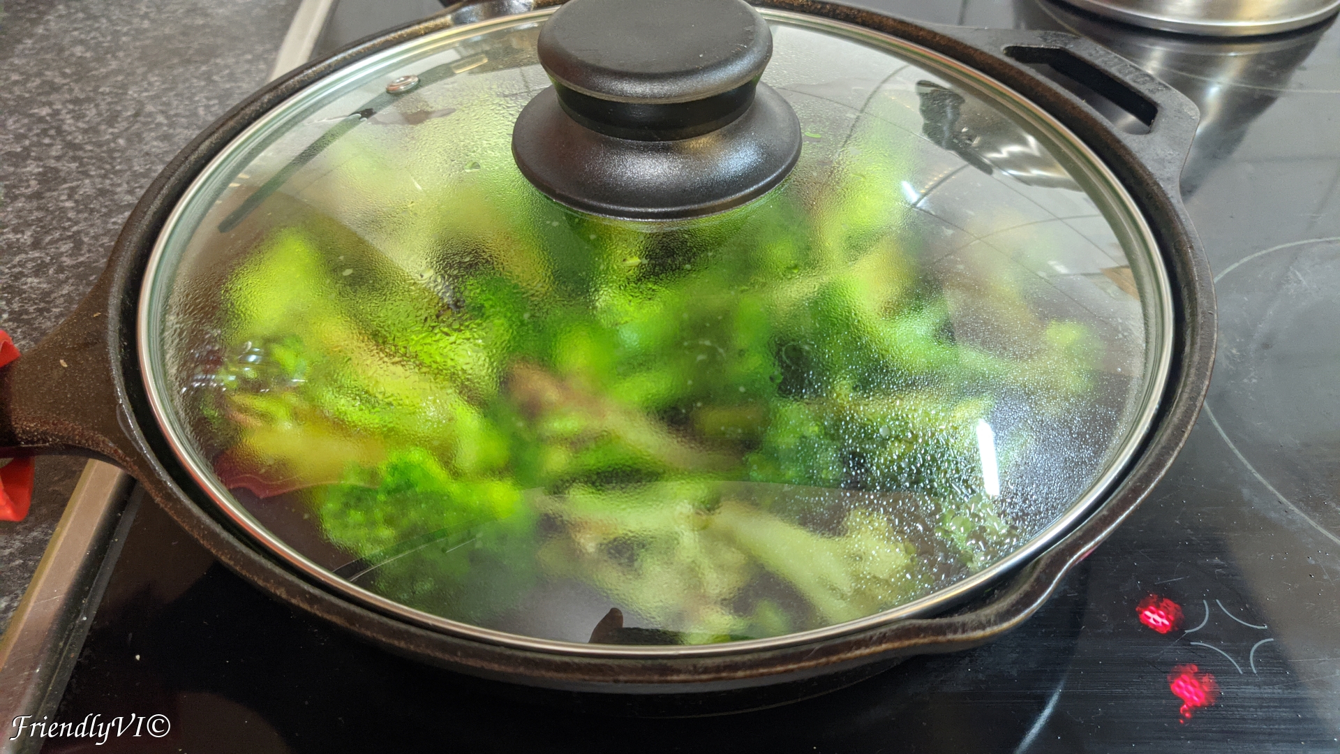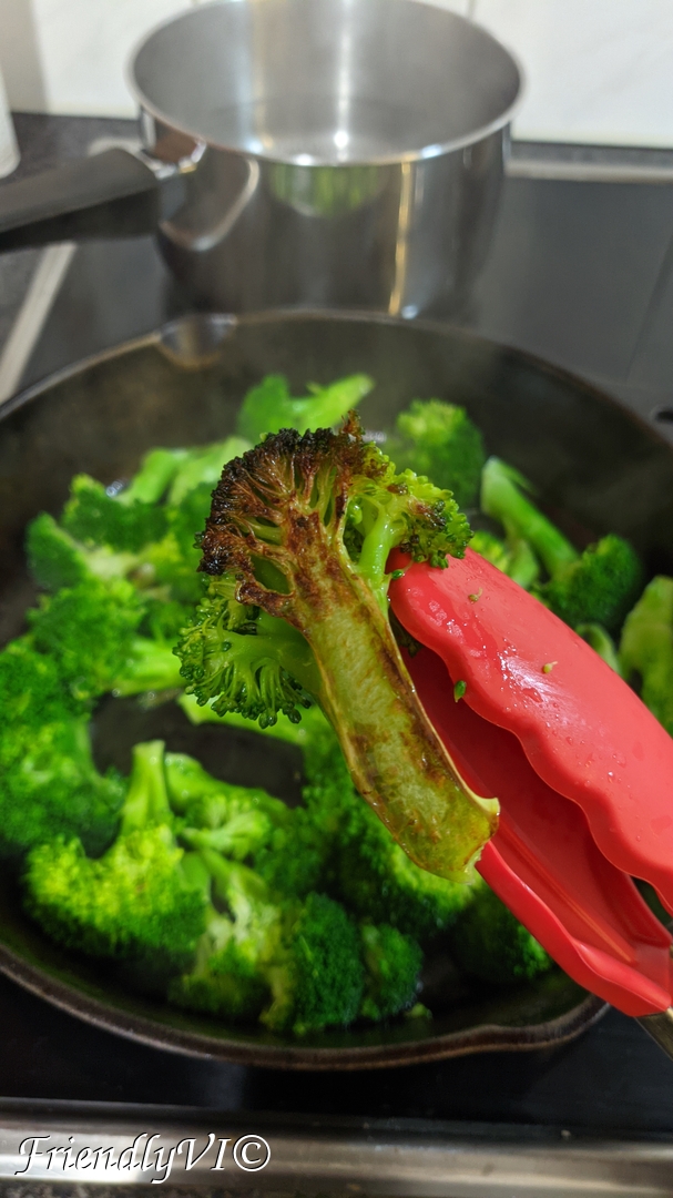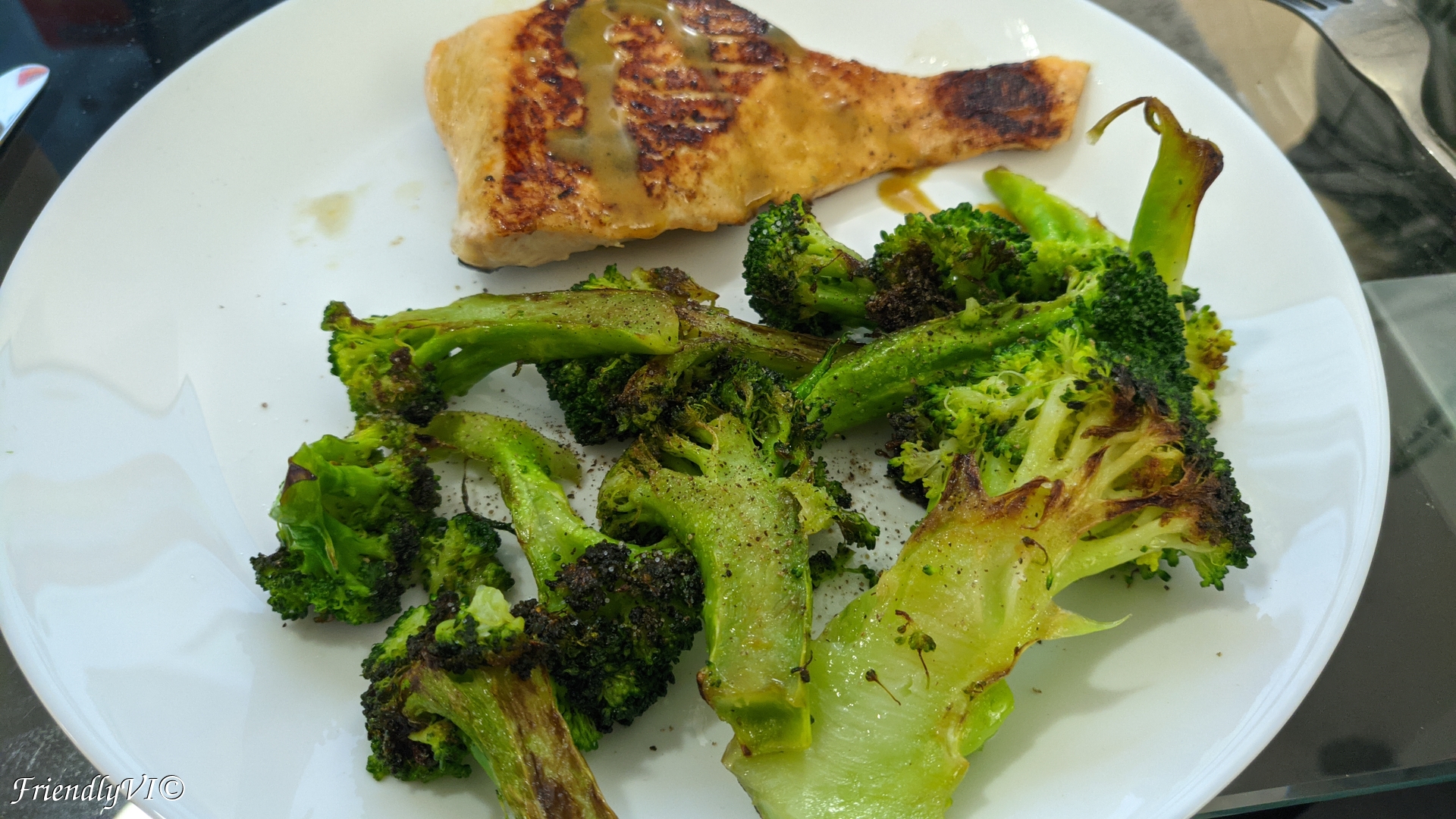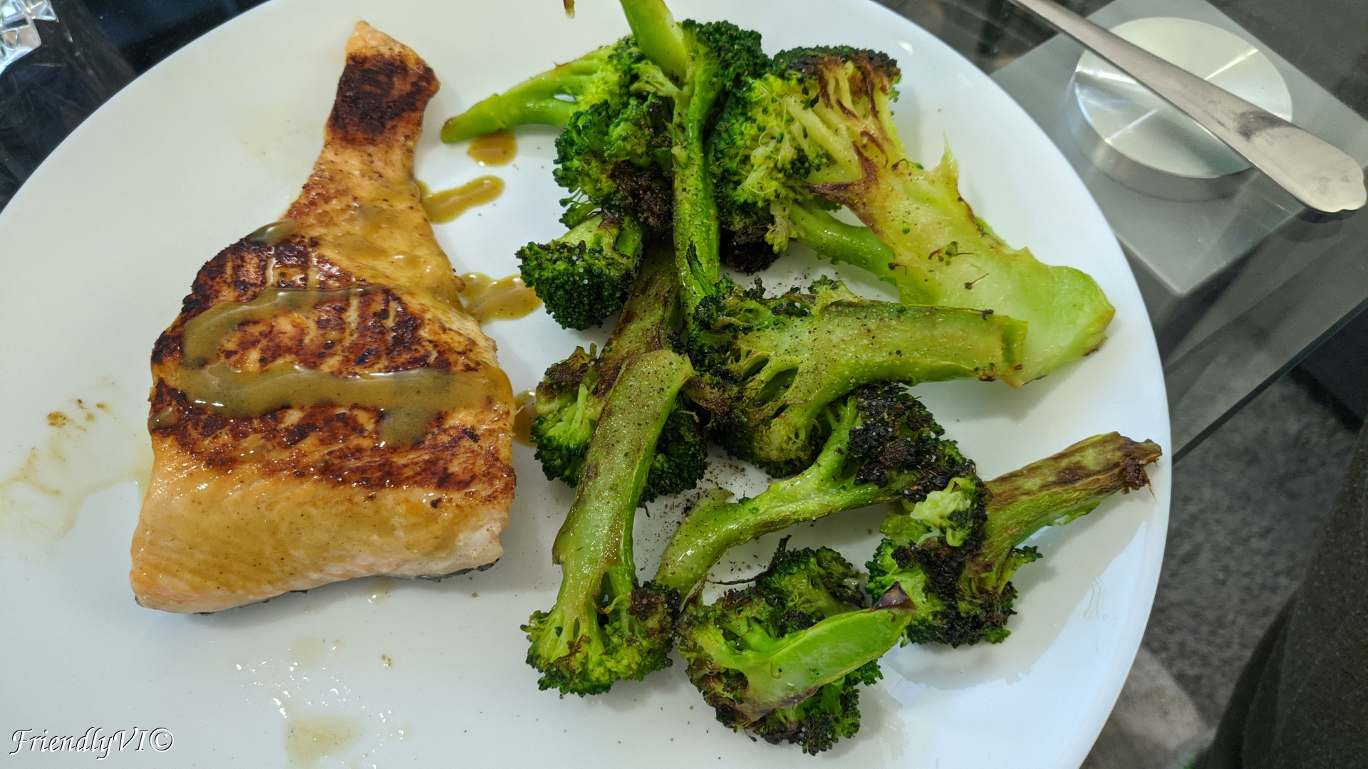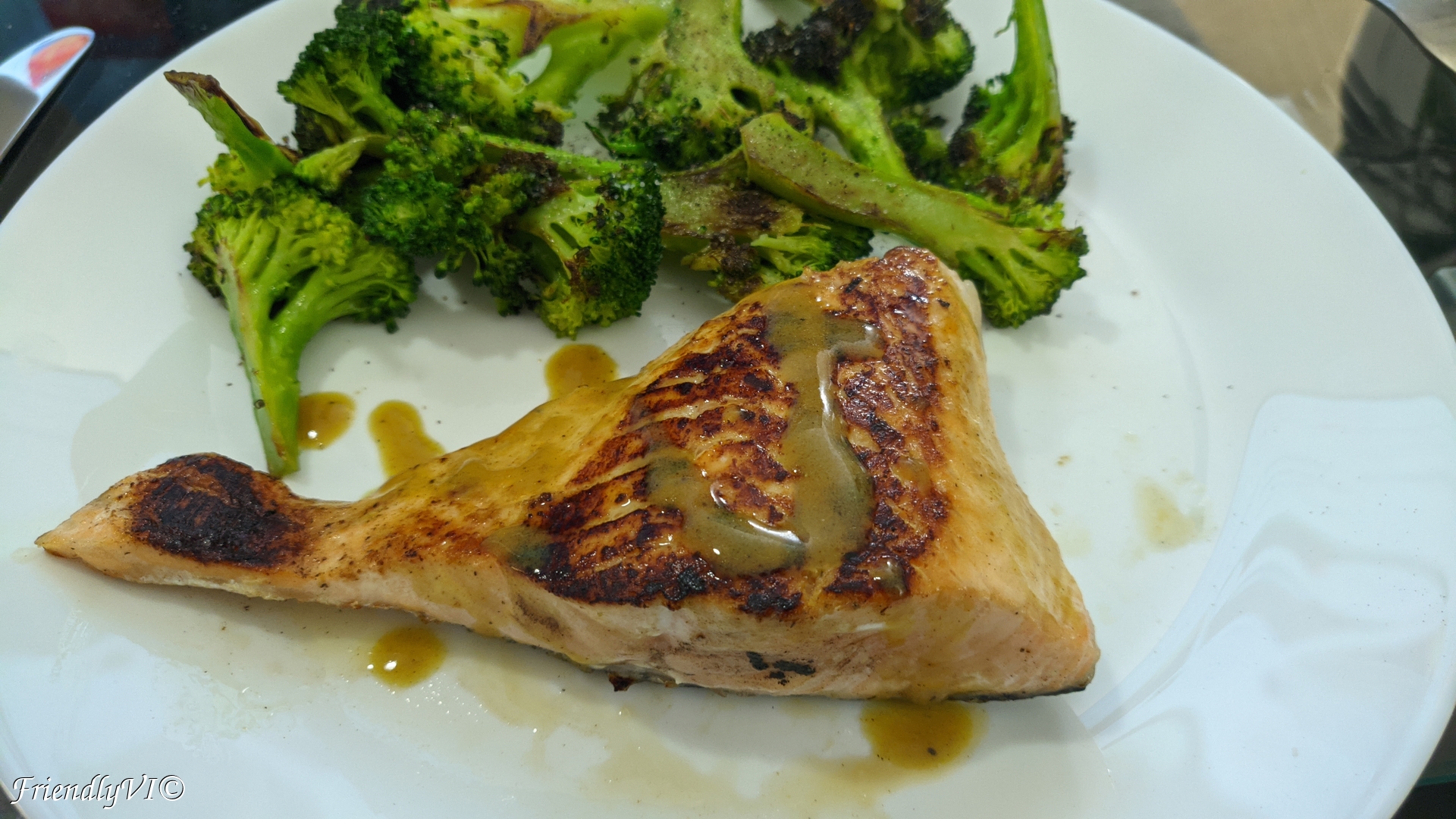 For this broccoli recipe I use the same technique as for my recipe for skillet roasted Brussels sprouts: make sure to cut the broccoli in half so that they get more surface area with the skillet. Have enough oil in the skillet, place the broccoli while the skillet is still cold and heat it on medium fire with the lid on until the broccoli is slightly brown. Cook for the rest of the browning with the lid off. The salmon is seasoned simply with salt and pepper and fried with little oil in the pan until it gets brown and I drizzled at the end a sauce made of mustard, a bit of honey (oops), balsamic vinegar, olive oil and freshly ground pepper.