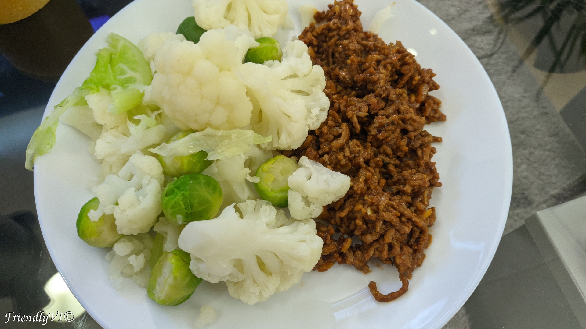 For the minced meat recipe I follow my moussaka recipe: basically you fry the meat in a very little oil until it is brown, then you add a chopped onion and garlic, in a few min you add some tomato paste and at the end season with salt, pepper and thyme. Boil cauliflower florets and optional Brussels sprouts to your desired tenderness and this one is ready too.