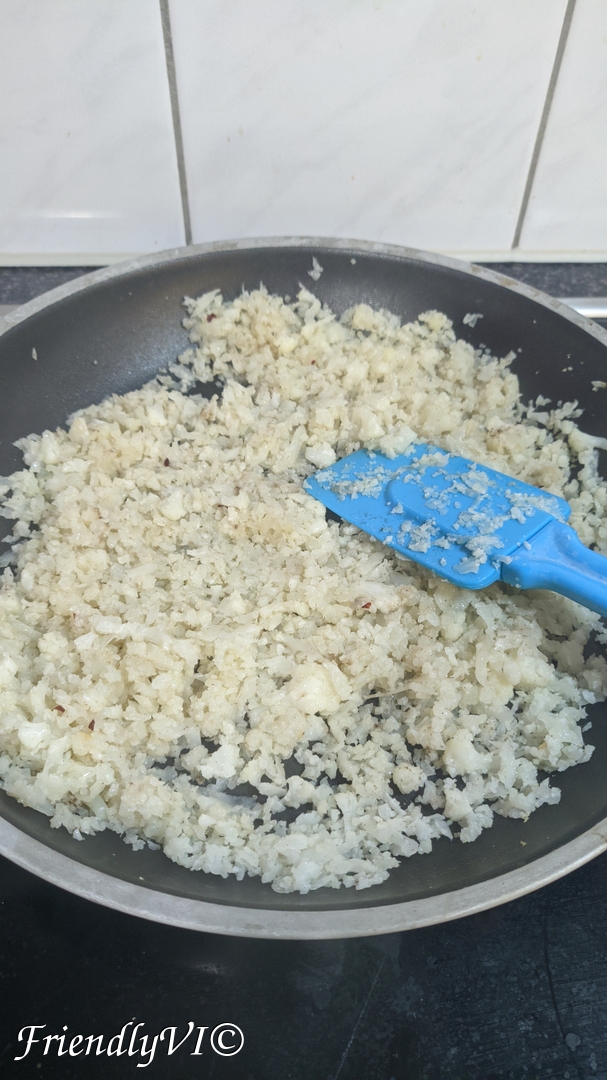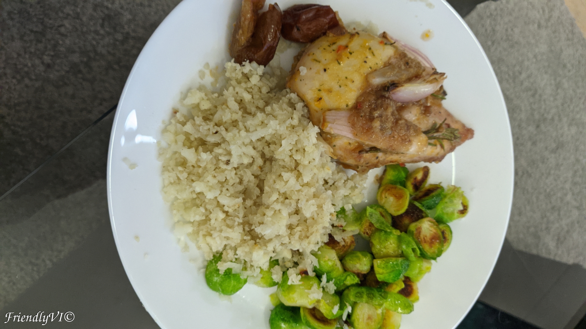 For this meal you can make only one side dish, of course, I just like to combine it. The Brussels sprouts recipe link is here. As for the cauliflower rice: grate the cauliflower, add it to a medium hot pan in a bit of sesame oil, fry it on medium heat for a few min and then season with MSG, soy sauce, pepper and optional chili flakes. For the chicken, I do not have a strict recipe, so use your favorite marinated chicken breast in the oven – I bought this one pre-marinated.