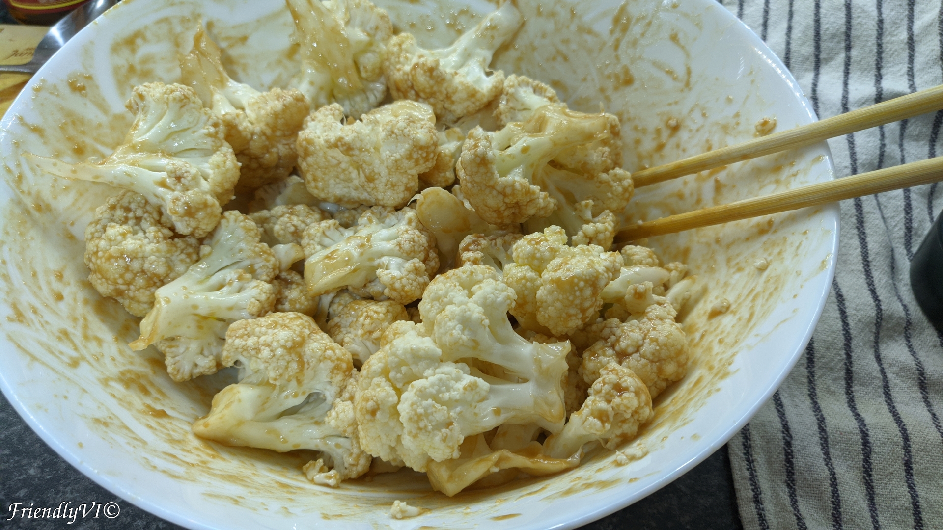 Again, no specific recipe for the chicken, so use anything you would like. But it is best to create the marination a day before and let the chicken be there for at least 12 hours so that it moisturizes enough for the oven. As for the cauliflower: I created a sauce made of 1 tbsp of olive oil, 1 tsp of balsamic vinegar, 1 tsp of sesame oil, 1 tsp of soy sauce, 1 tsp of miso. Coat well the cauliflower florets and bake it in the oven at 220 C for 30 min.