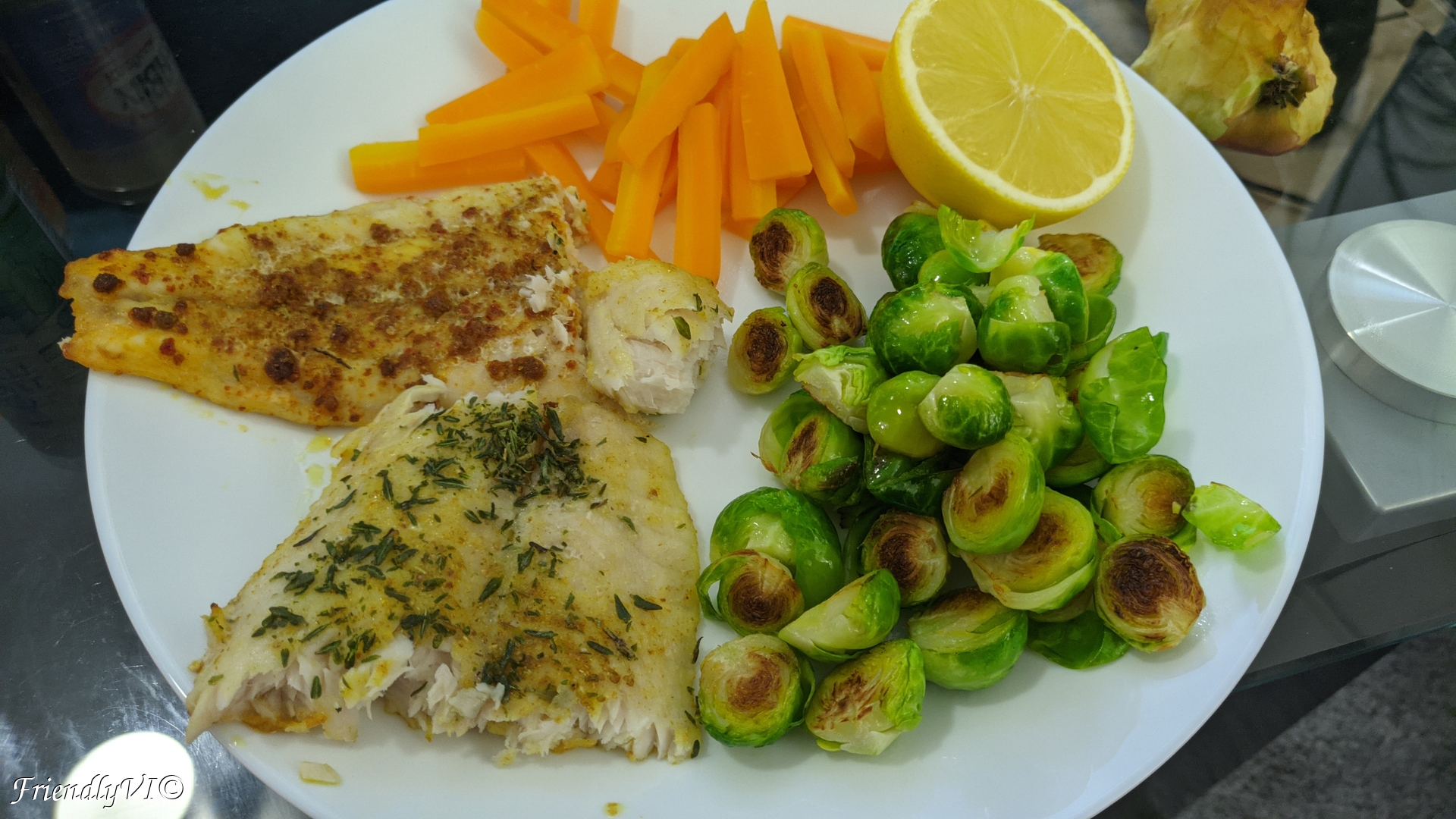 This is such an easy meal to make: pat dry the fish and season with salt and pepper and thyme. Fry it in a pan with minimum amount of oil. For the Brussels sprouts I follow my recipe for skillet roasted Brussels sprouts that will make them taste caramelized, sweet and incredibly delicious. Cut some parmezan, add some optional boiled carrot, season with salt and pepper and it is ready!