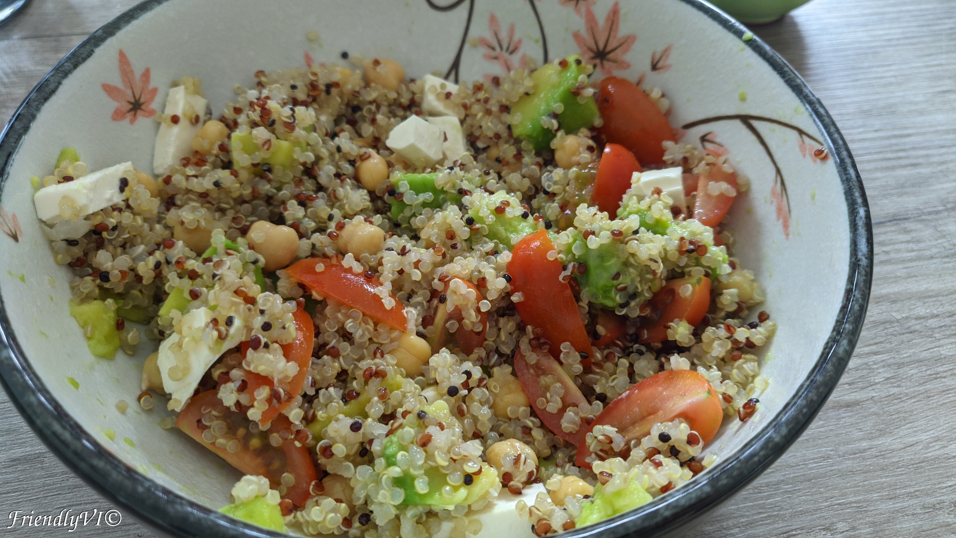 Quinoa salad with chickpeas, cheese, tomatoes and avocado