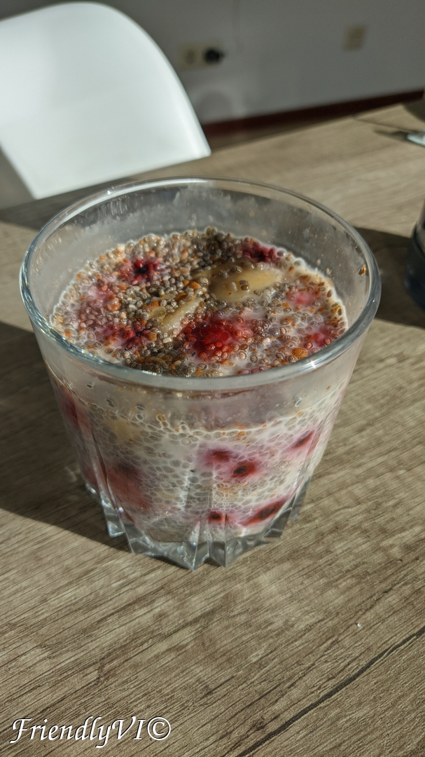 Chop half a banana (not the most low carb, but we aim at low sugar, not zero sugar), add some frozen blueberries and raspberries, 2 tbsp of chia seeds, sprinkle some cinnamon and fill your glass with your favorite milk. This goes really great with coconut milk. It is so good and easy to make and it will keep you full of energy for hours due to the high amount of protein in the chia seeds.