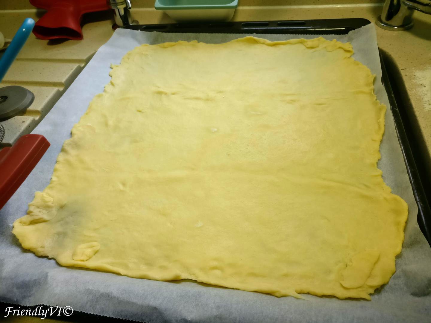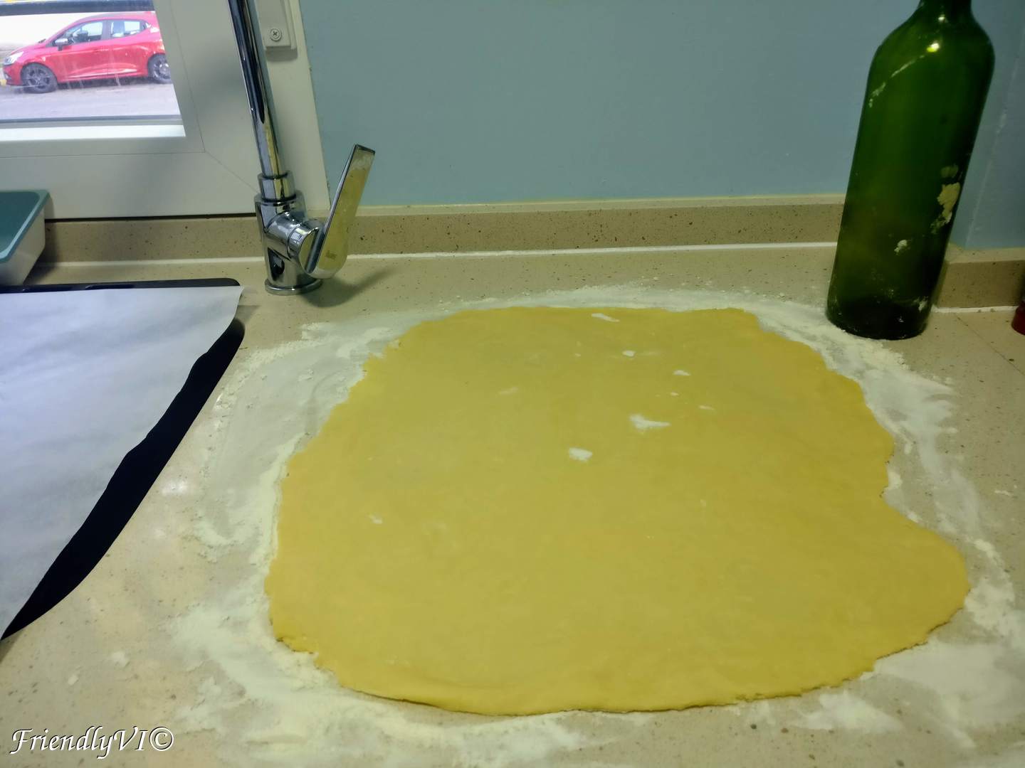 - Take out of the fridge on half of the dough and stretch it into a very thin rectangular piece, the size of your tray. Mine measures 34/37 cm.