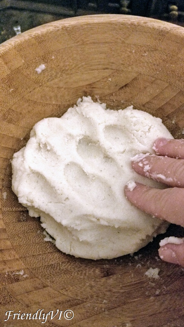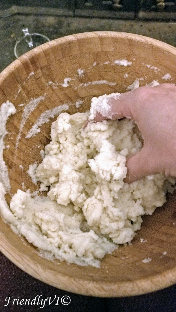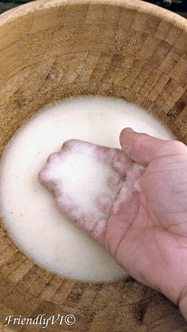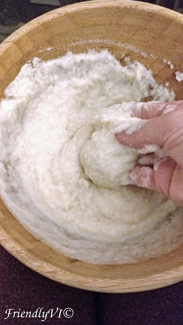 - Add the cornmeal bit by bit. Half way through it will thicken significantly and the second half it will magically become very elastic and easy to manipulate. Mix 1-2 min.
