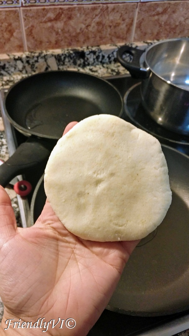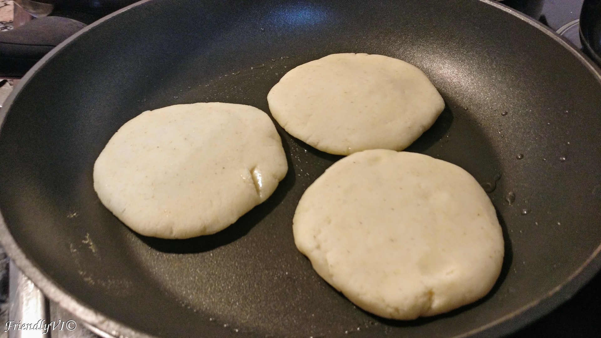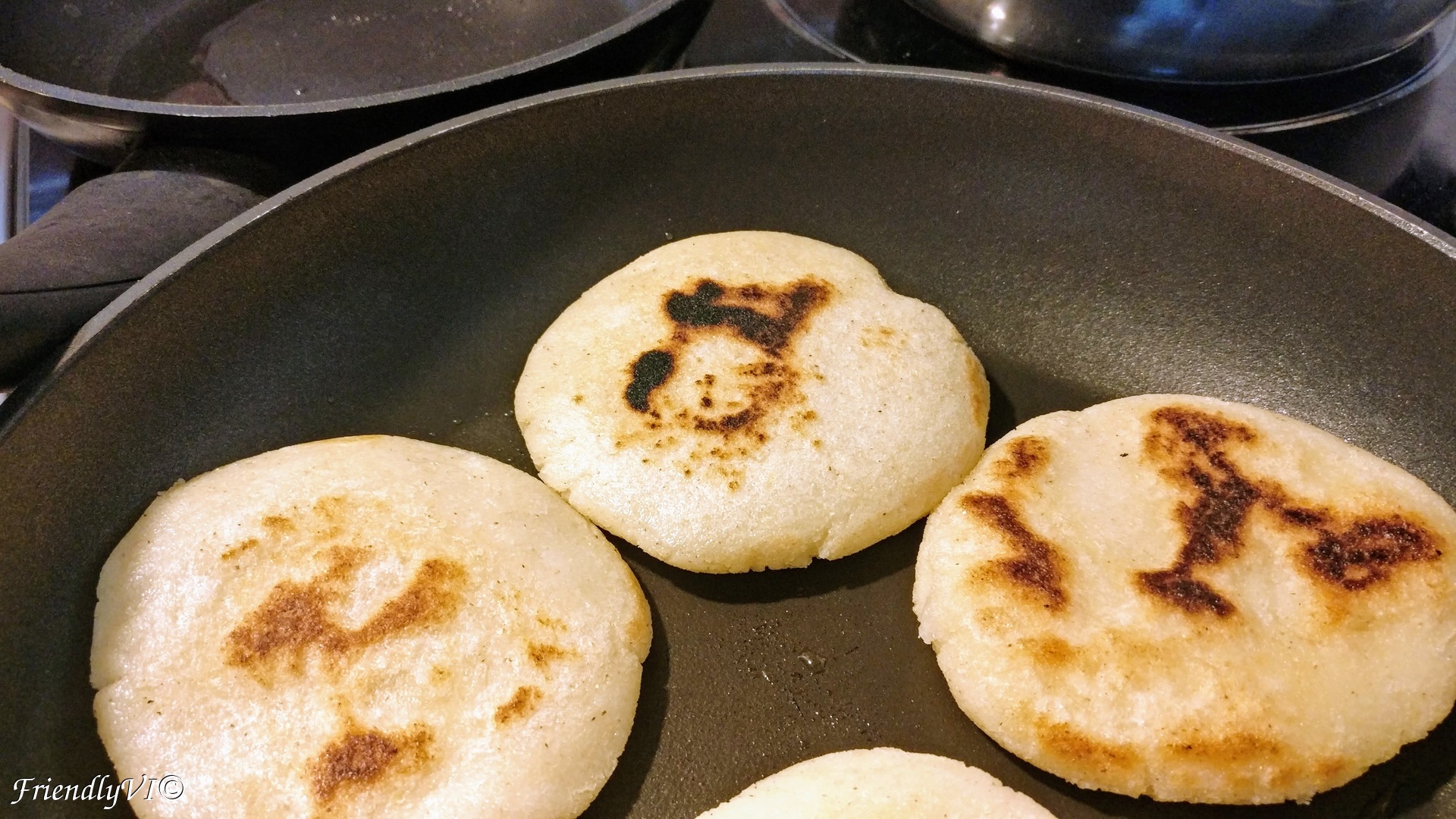 - In a hot pan with a bit of sunflower oil in it, fry the arepas on medium heat for 5 min on each side.