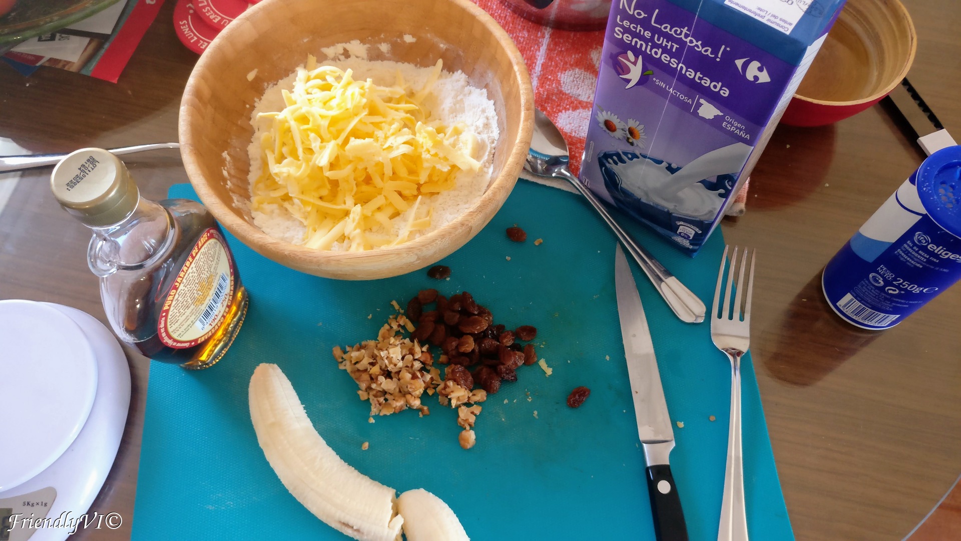 - Mix the rest in: 2 tablespoons of milk, banana, syrup, walnuts and raisins.