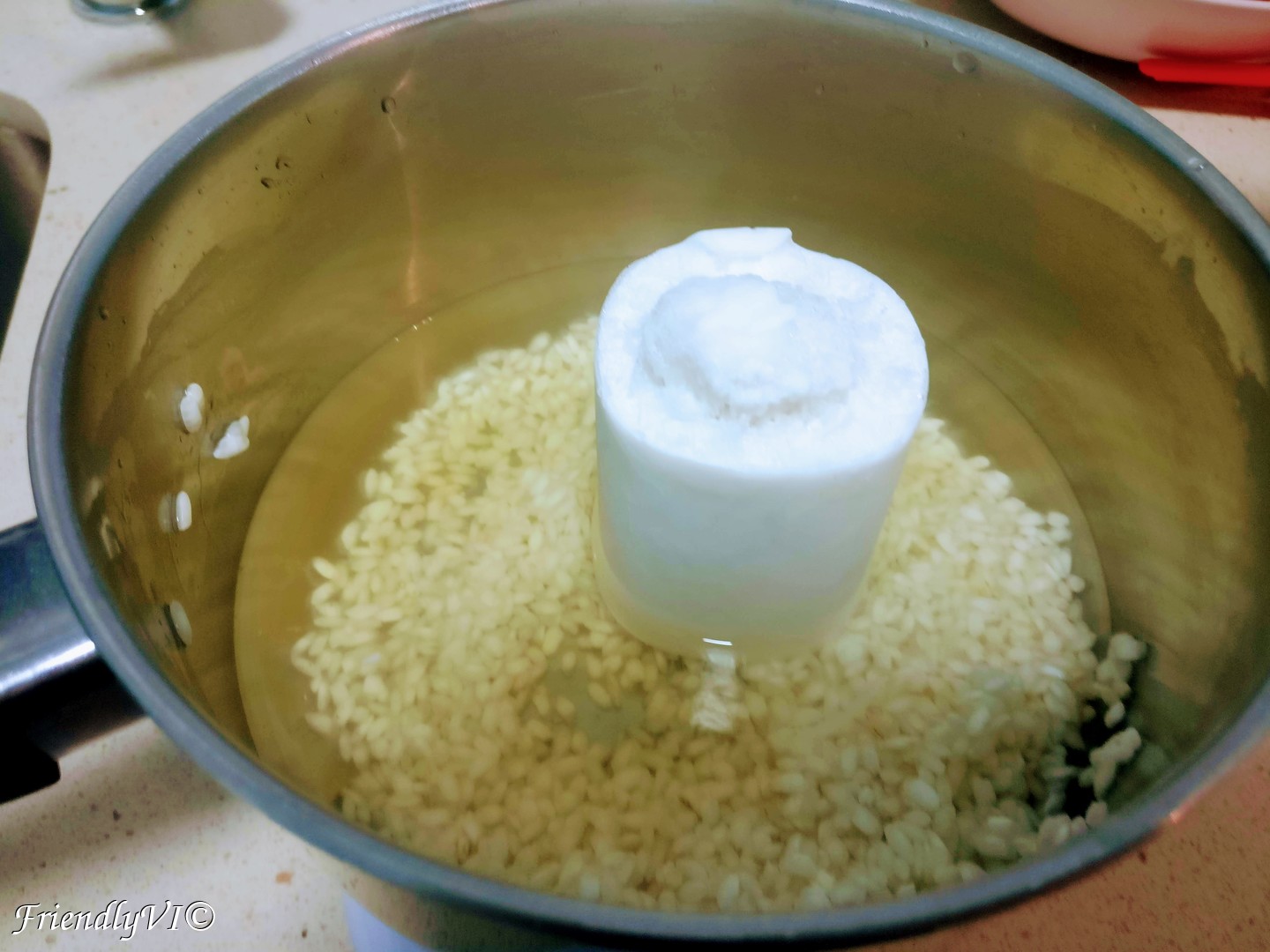 - Bring the rice with the coconut milk, apple juice and water to a boil, then turn it down to low (I use setting 3 out of 10) and simmer it until it gets soft (even in the middle). Usually the minutes recommended on the package are more or less correct.One good trick for the coconut oil is to freeze 150g (125g works too) in yogurt cups for future use. It is a perfect way to prevent it from spoiling and always have at hand the coconut milk when you need it.
