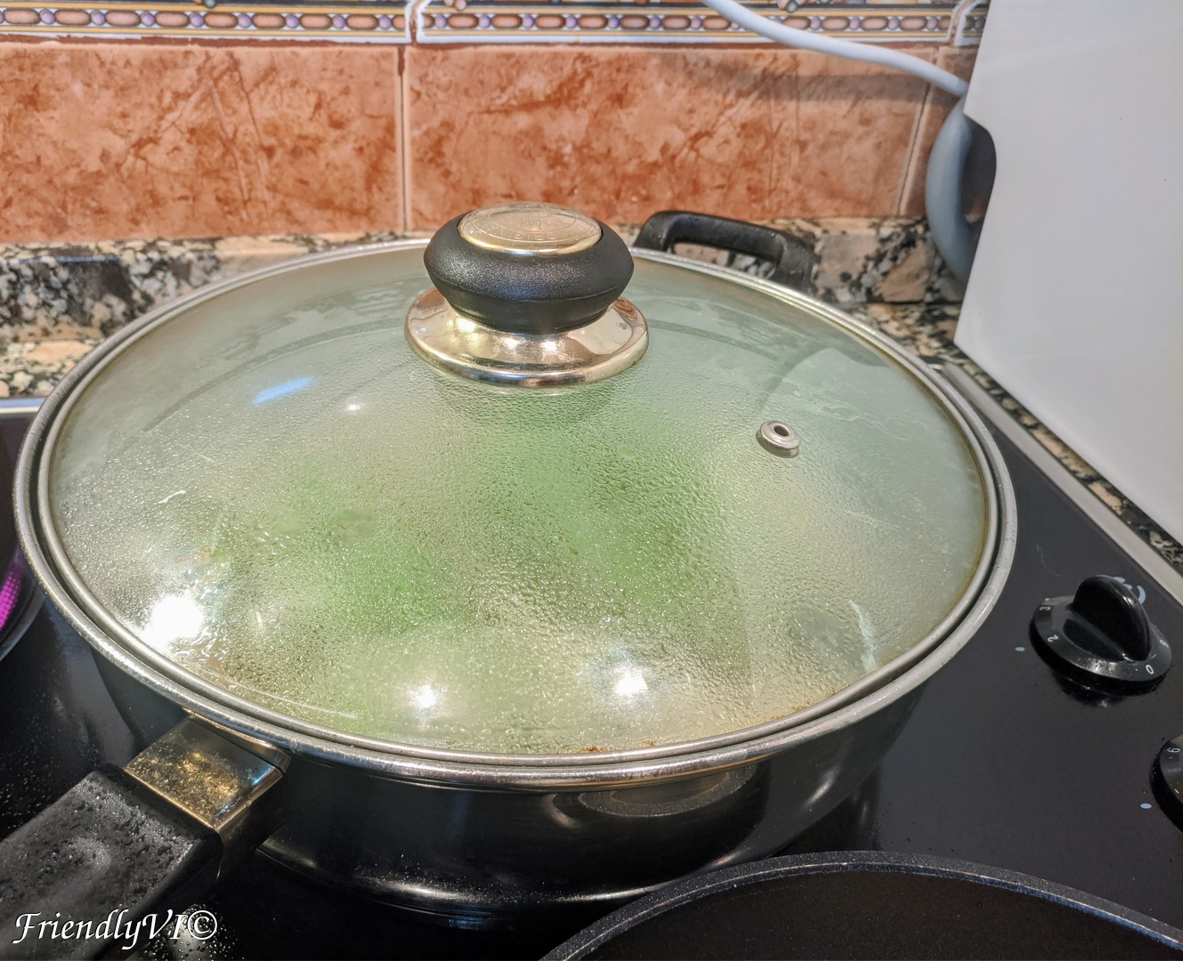 - Immediately add the stock as well (it will splash water, so be careful) and cover with a lid.