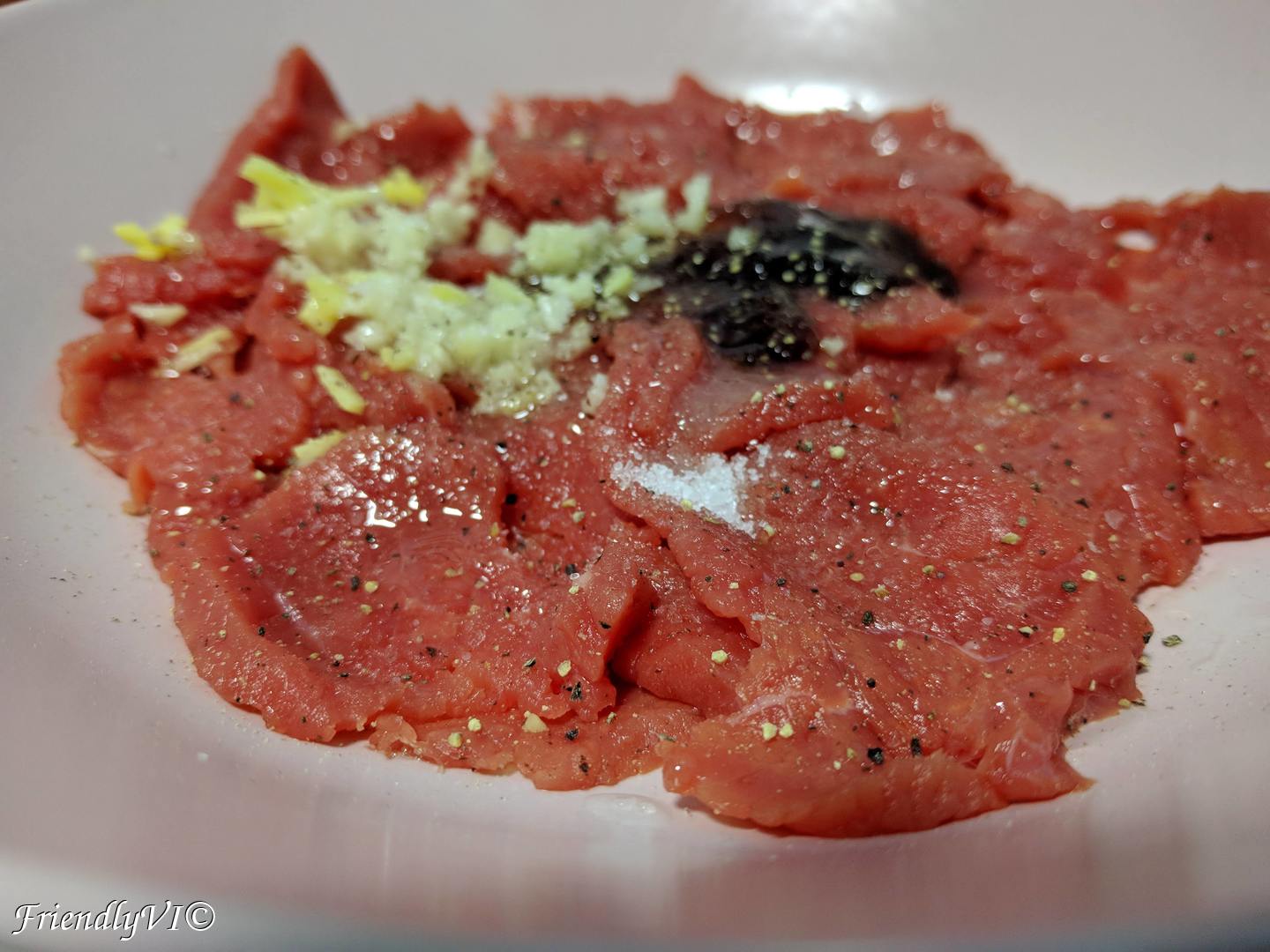- Cut the beef steak in VERY thin slices, this will make is very tender. Add all the ingredients over the meat: oyster sauce, garlic, ginger, oil, salt, sugar, pepper. Mix all the ingredients for a bit and let them marinate for 15 min.