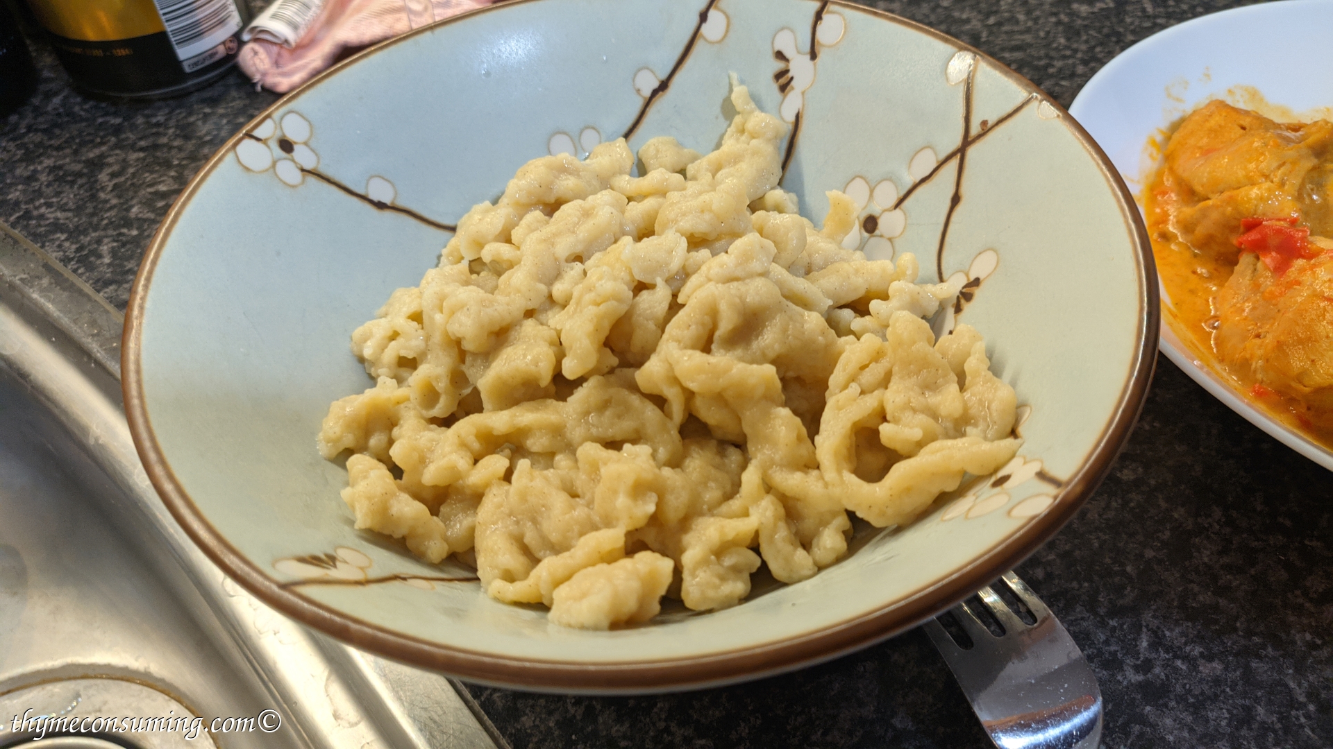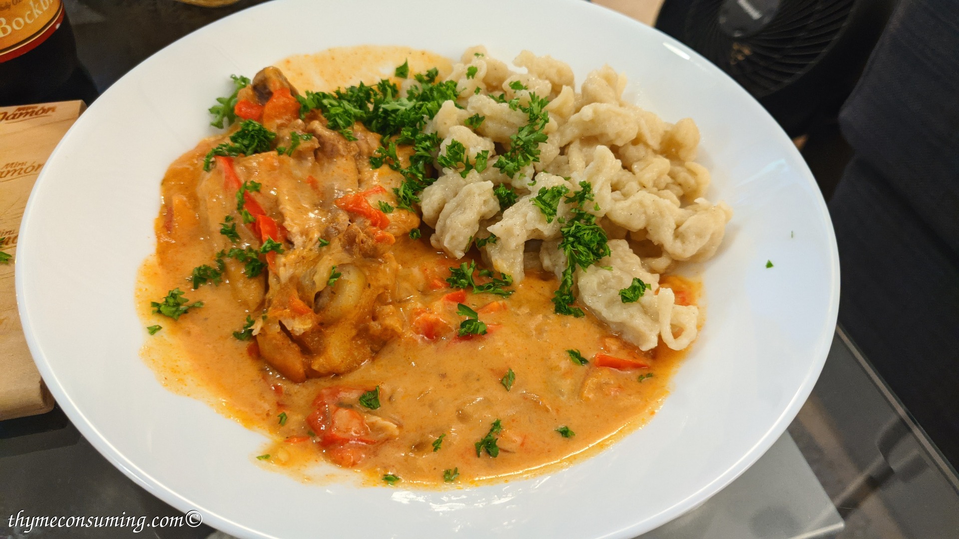 - The chicken paprikash can be served with any side dish, but the best fitting and most traditional is nokedli in Hungary, also known as spaetzle in Germany. It is so easy to make them: mix two eggs with salt and pepper. Add 4-5 tablespoons of flour and water, until they have the consistency in the video above. Shred them with a spoon in the hot water and take them out with a sieve when they float, which is after 1-2 minutes.