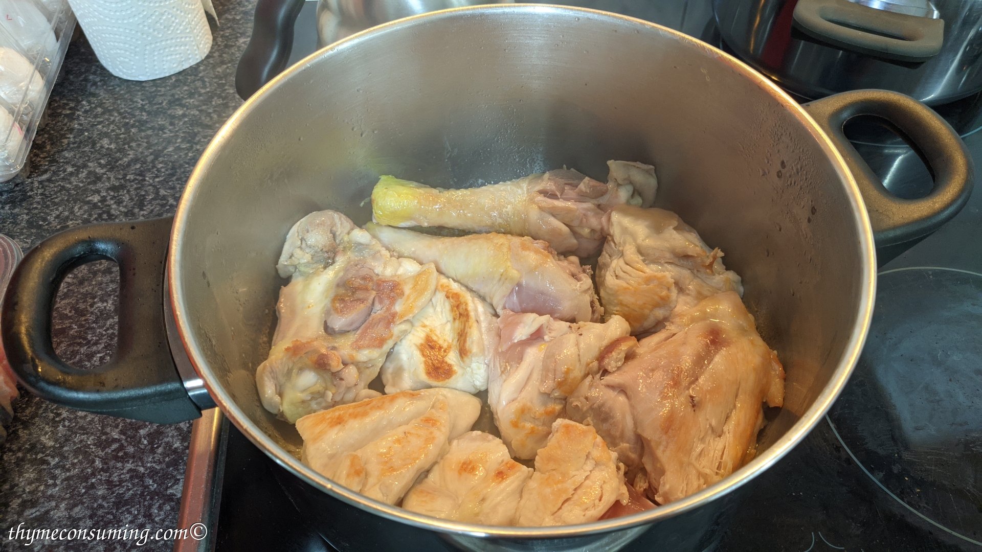 - In the warm pan with melted pork fat add the meat on medium-high fire until it gets nice an golden on both sides. The meat used traditionally in this recipe is chicken thighs. But I used thighs, legs and also chicken breast.