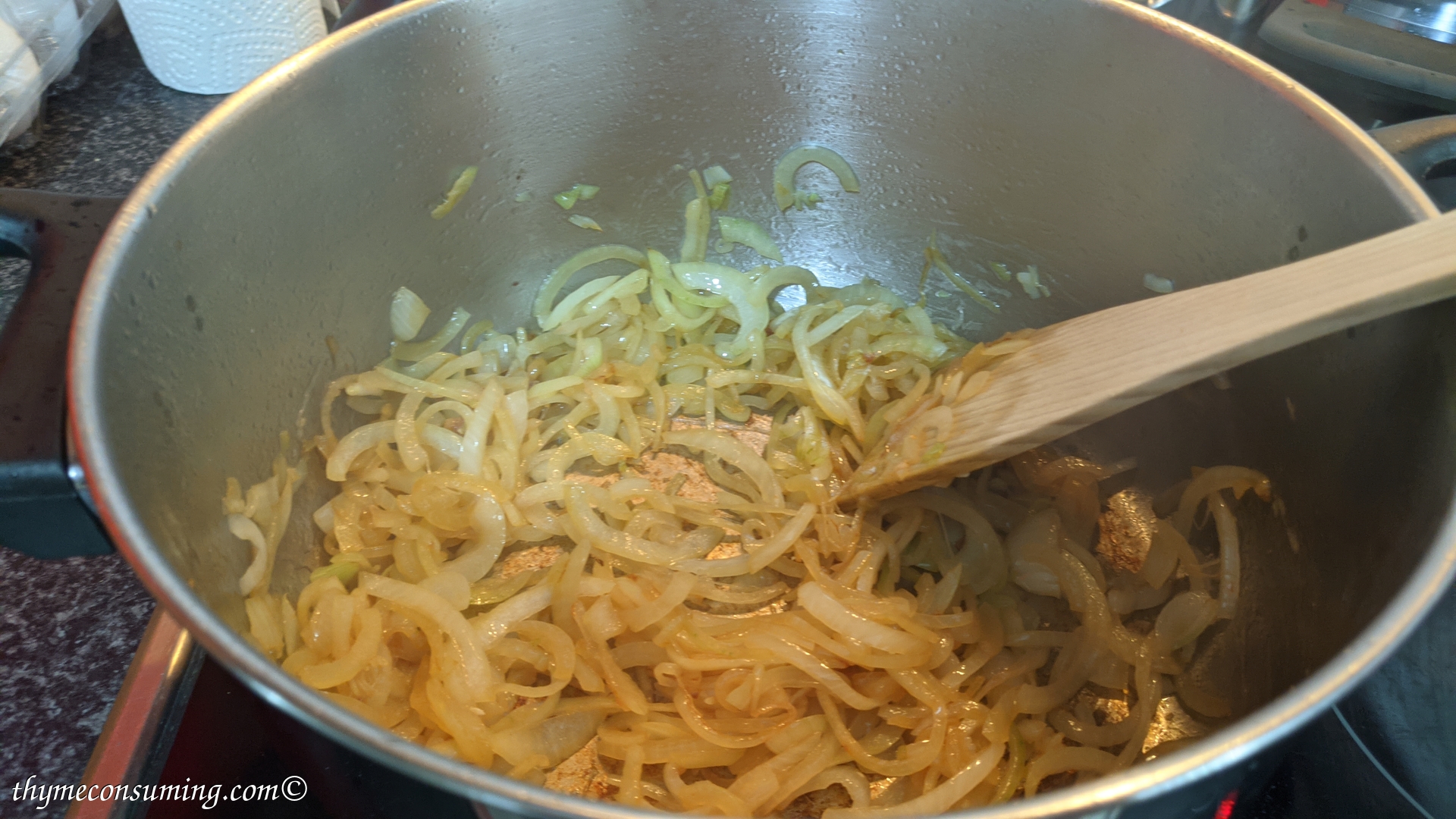 - In the remaining fat that is browned add the two onions cut julienne.