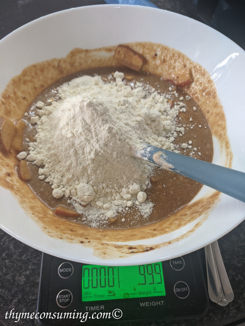 - At the end add the 95 g of flour and the 1 teaspoon of baking powder.