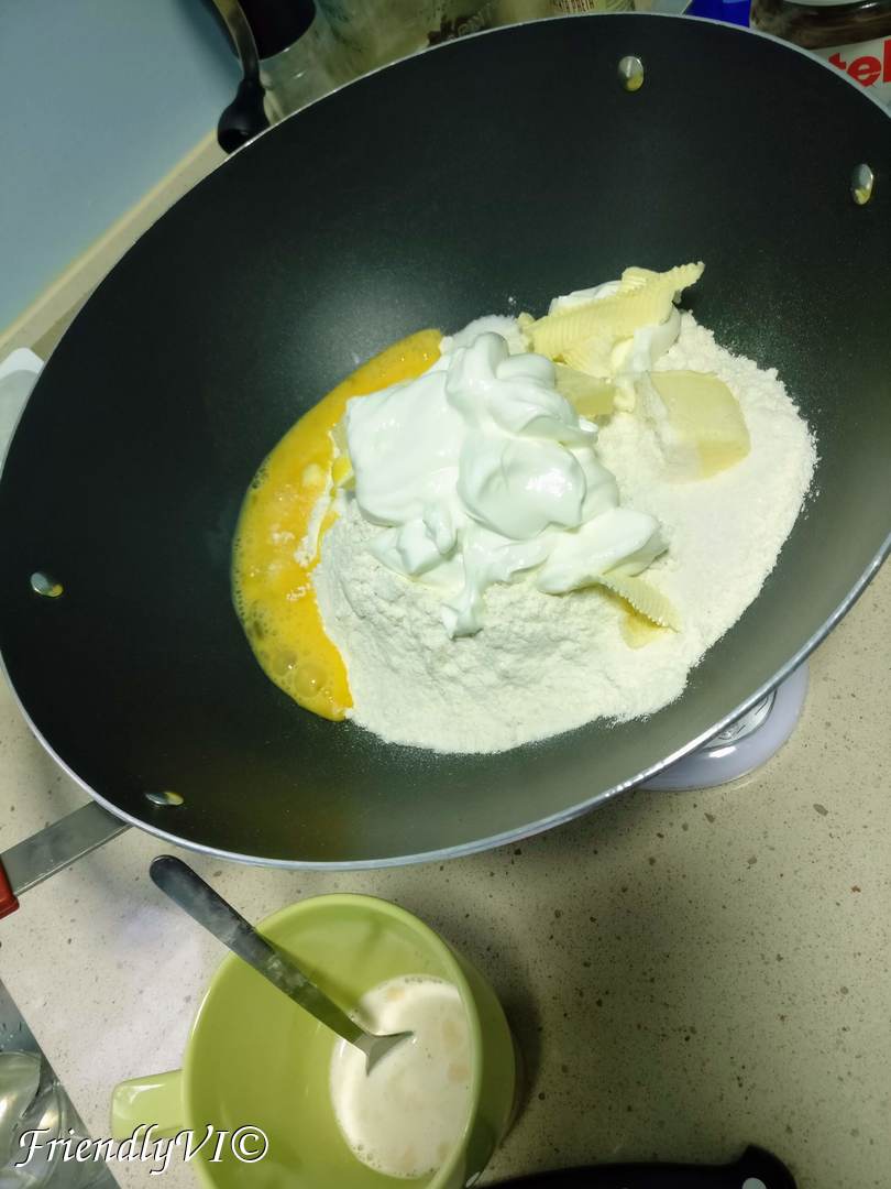 2. In a big bowl mix the flour with the salt, add the yogurt, the room temperature butter and the egg. Reserve a bit of the egg for brushing on the top.