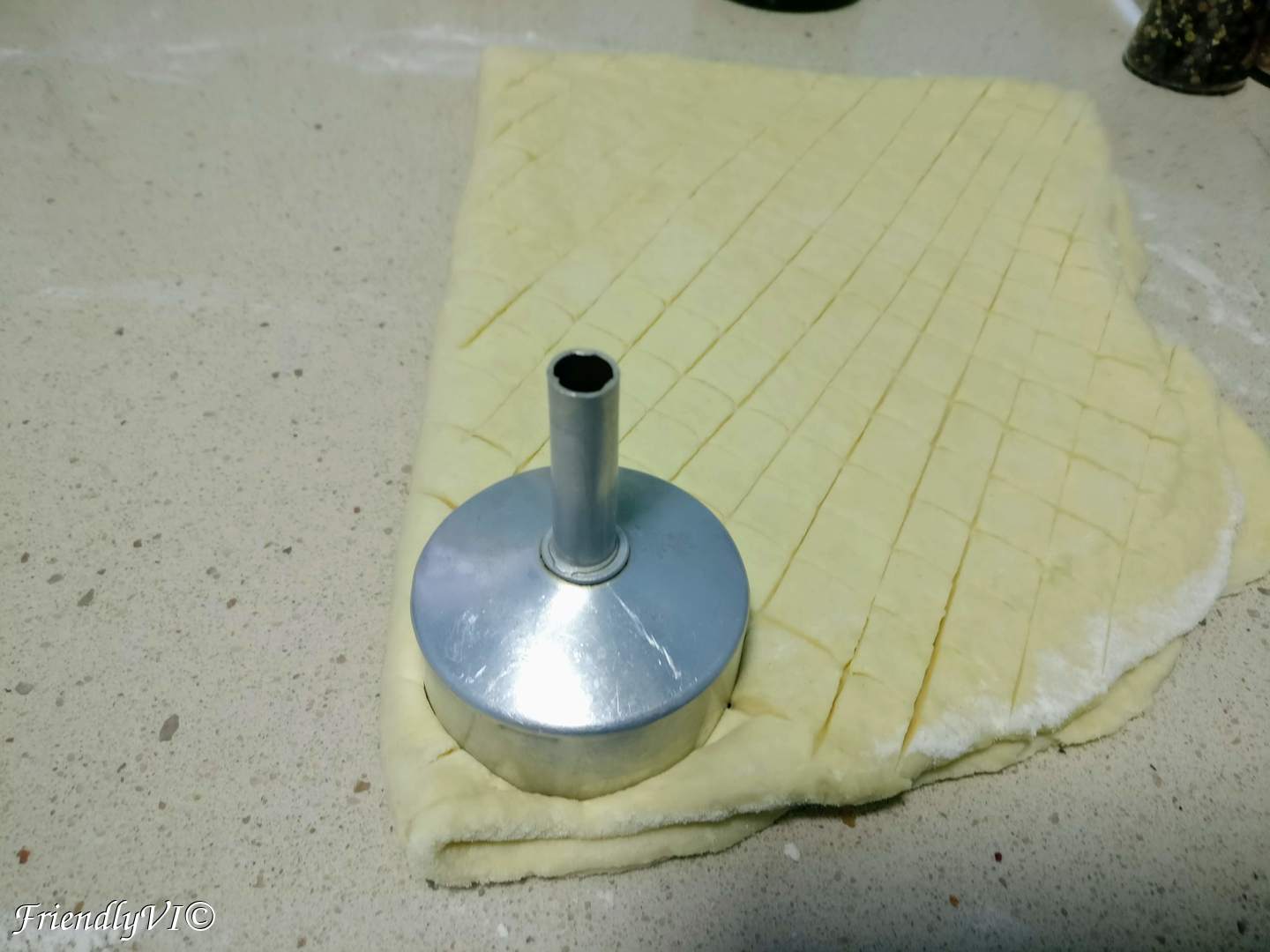 10. Choose the size you want and with a glass/moka filter start cutting circles out of the dough. You can rub the glass in a bit of flour.