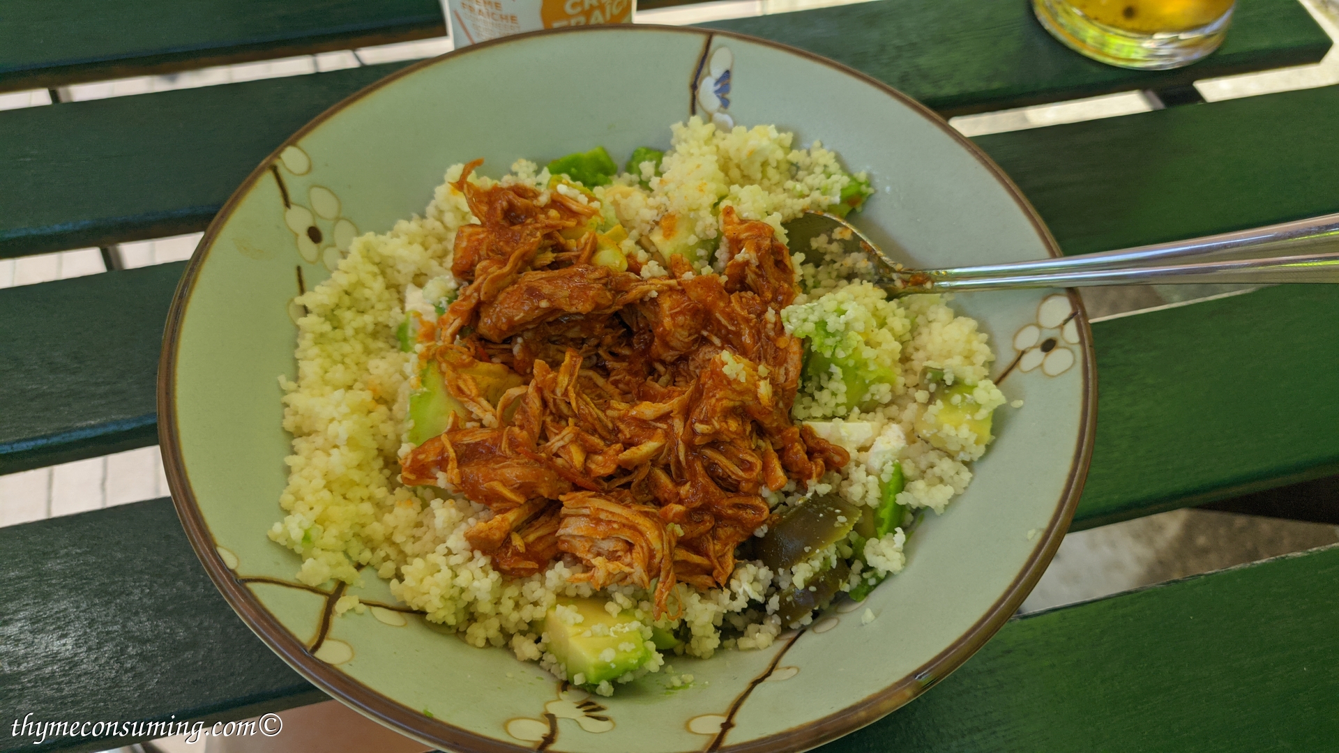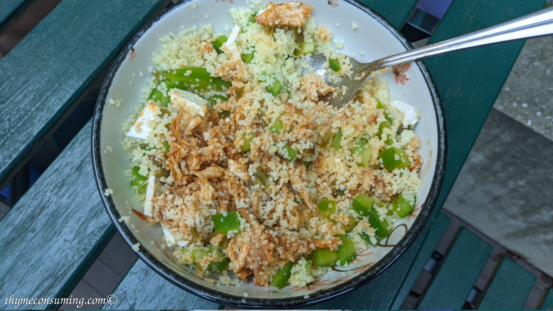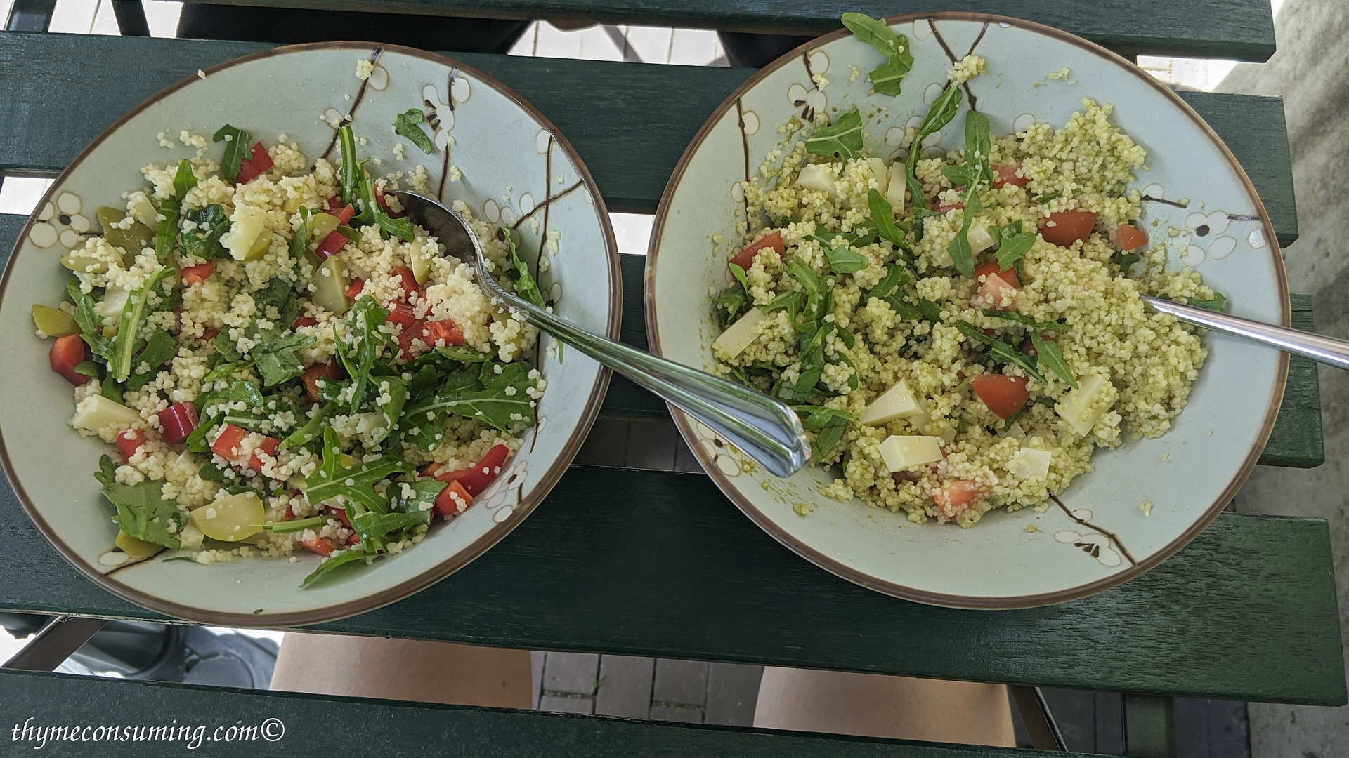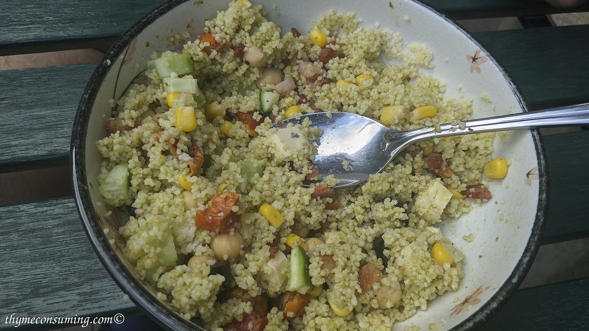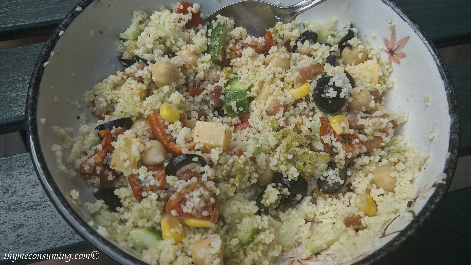- Pesto, marinated tomatoes, corn, chickpeas, cucumbers, feta cheese, optional black olives: