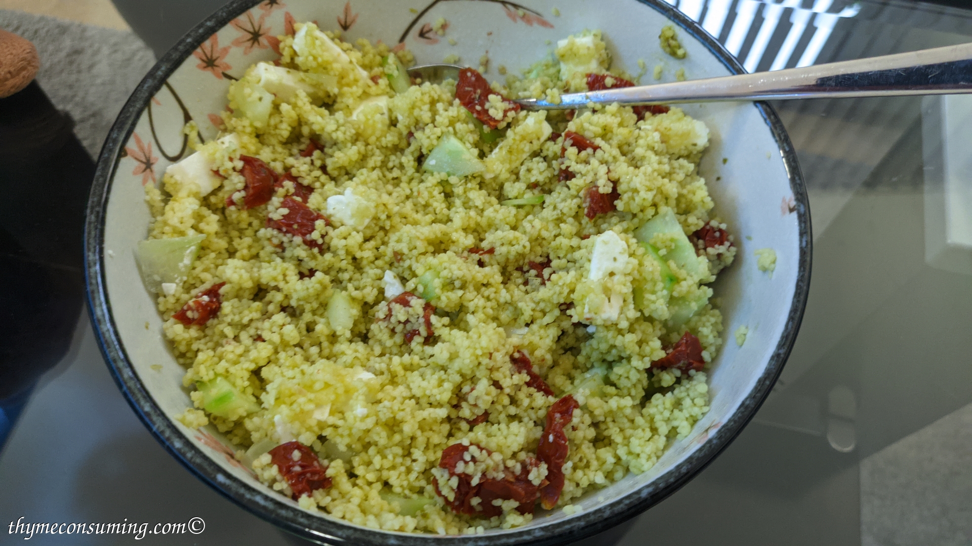 - Pesto, sun dried tomatoes, feta cheese, cucumber, optional corn: