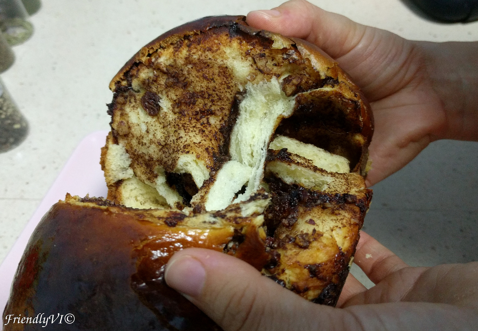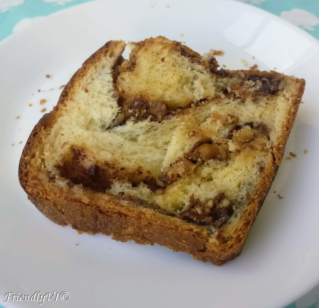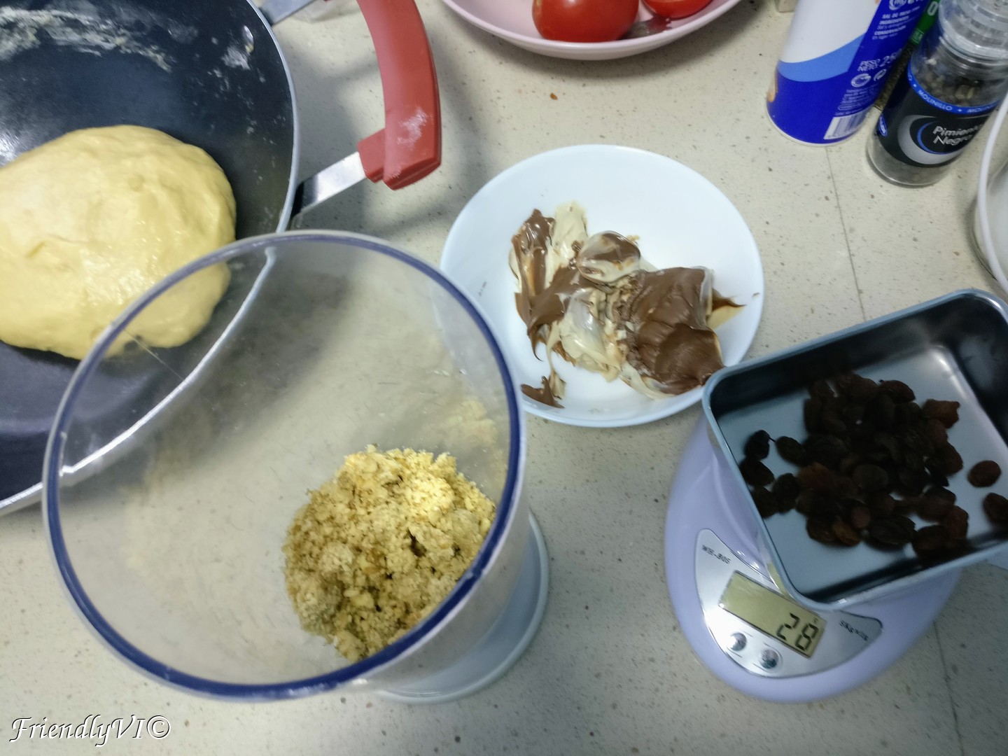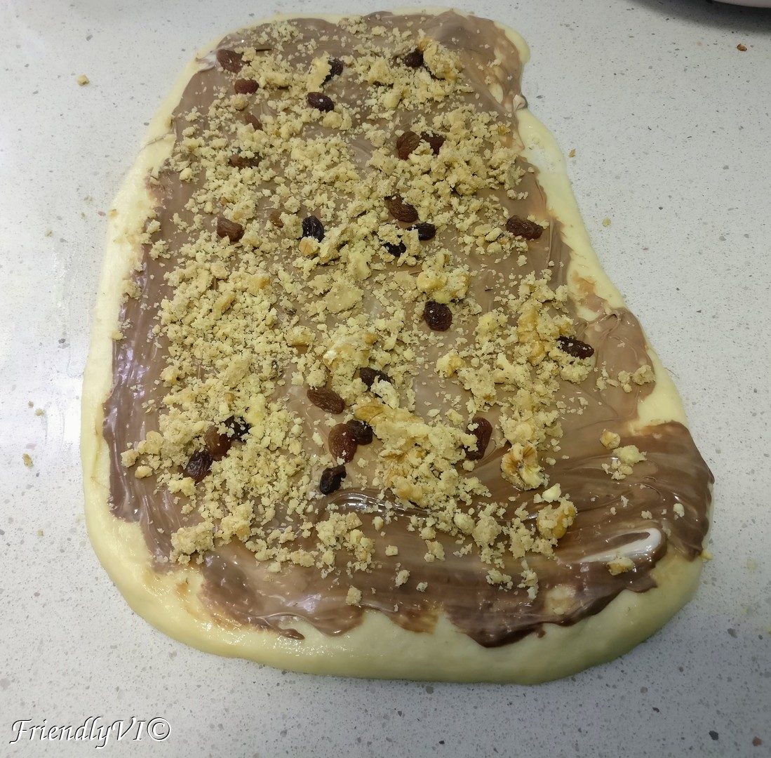 14. Add your filling, in my case chocolate cream, walnuts and raisins.