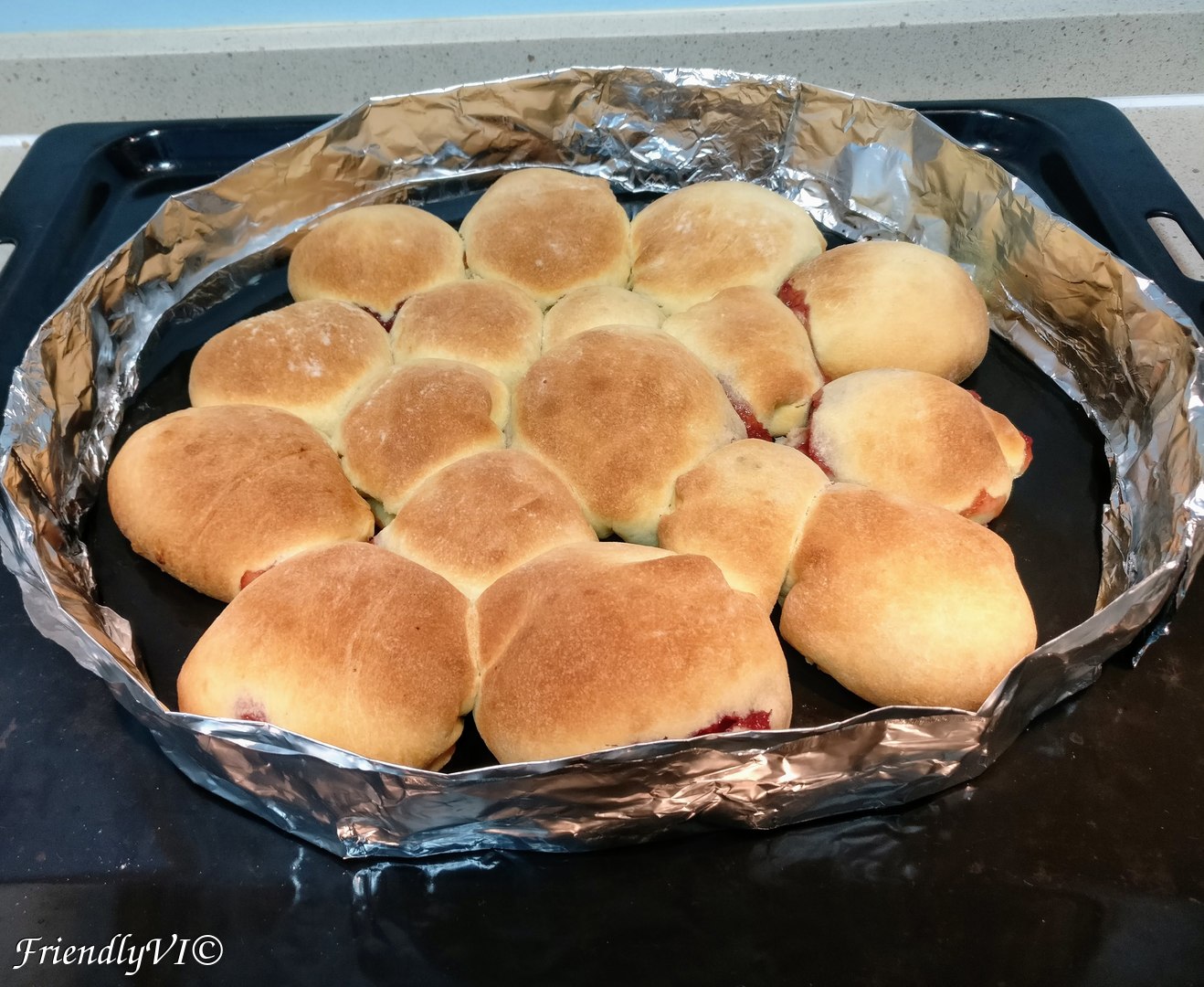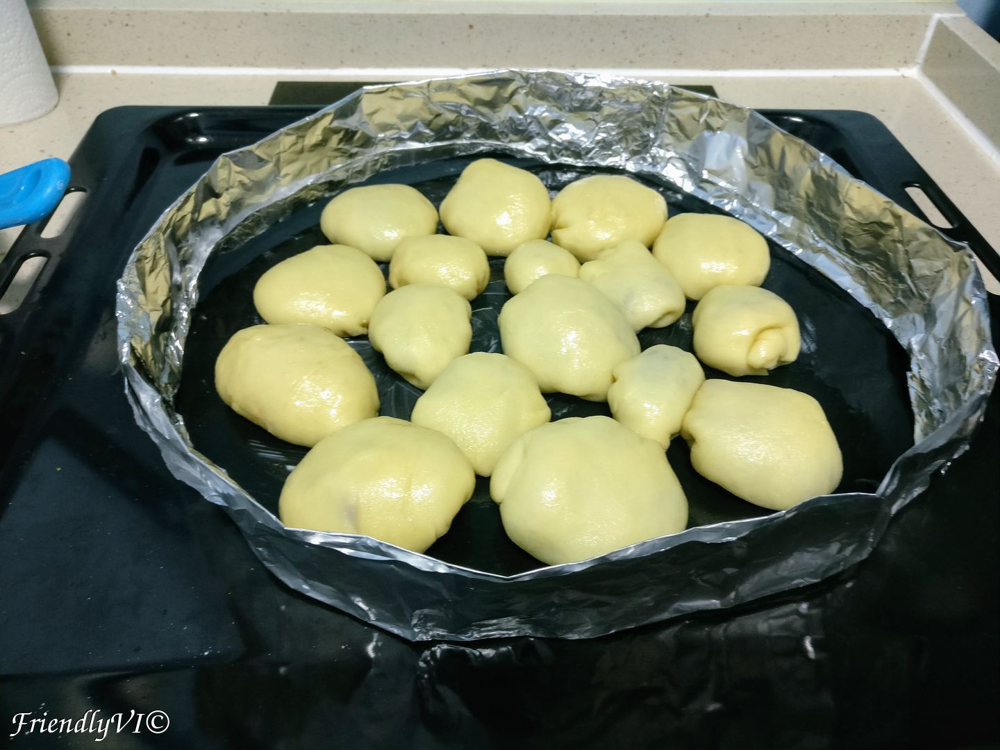 - Place it in a deep tray (since I don’t have one, I created it from aluminum folio) that has butter on the bottom. They can and should touch, since this is how the original recipes are.