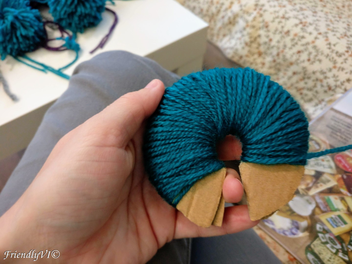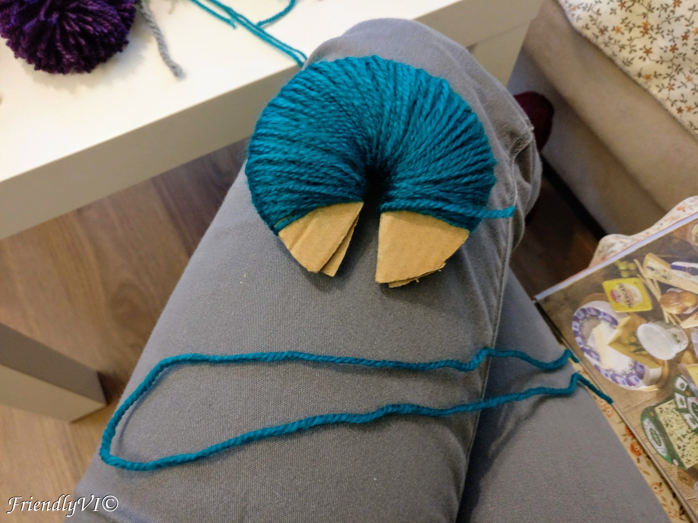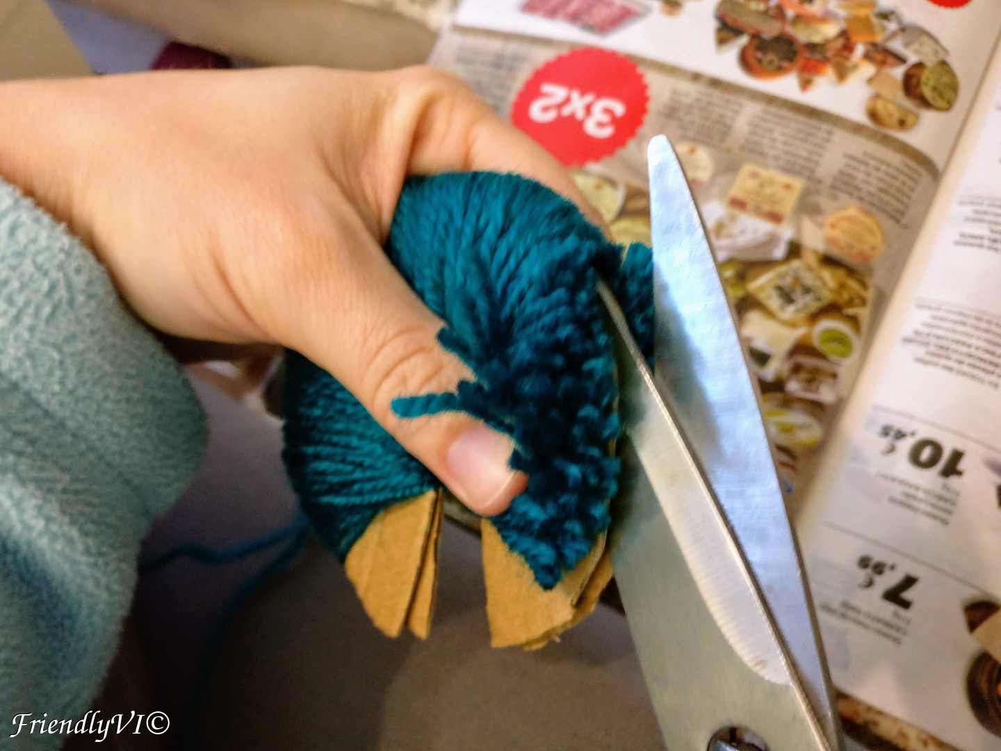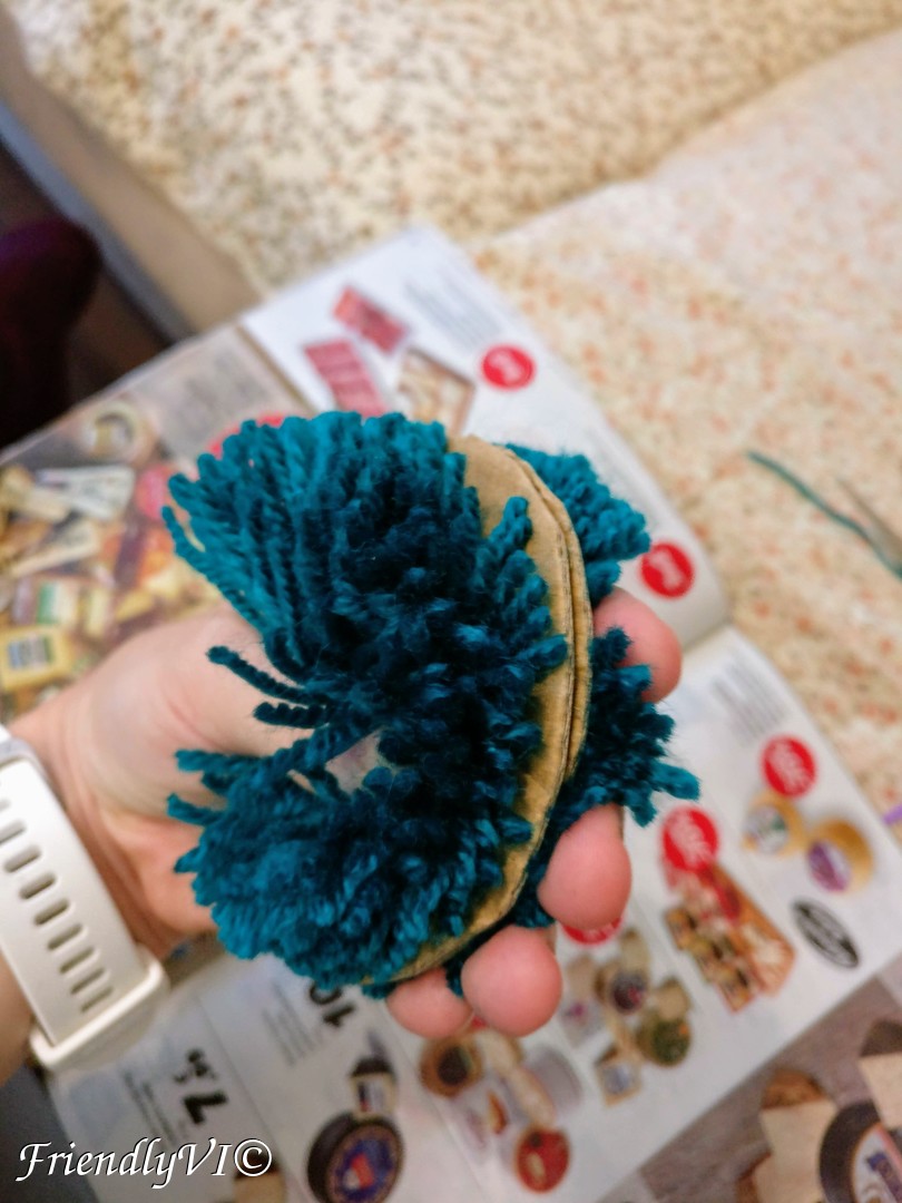 In order to shape it up place on piece of the cardboard on the bottom and the other on the top and start cutting everything that sticks out. Do the same on thing after you flip the pom-pom on the other side.