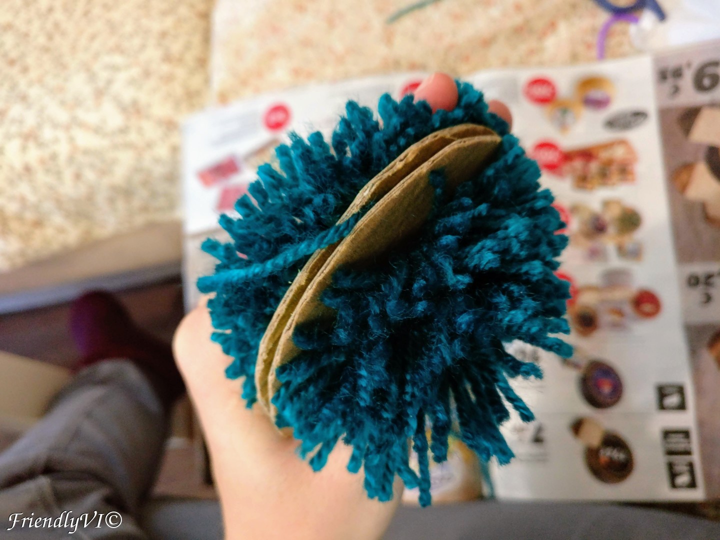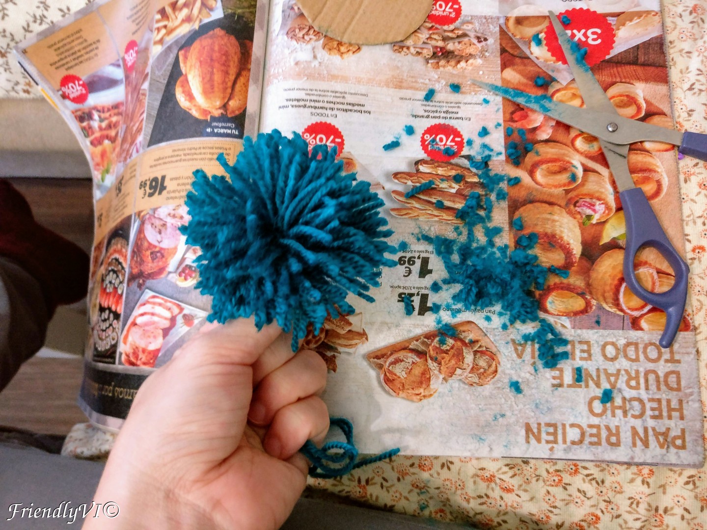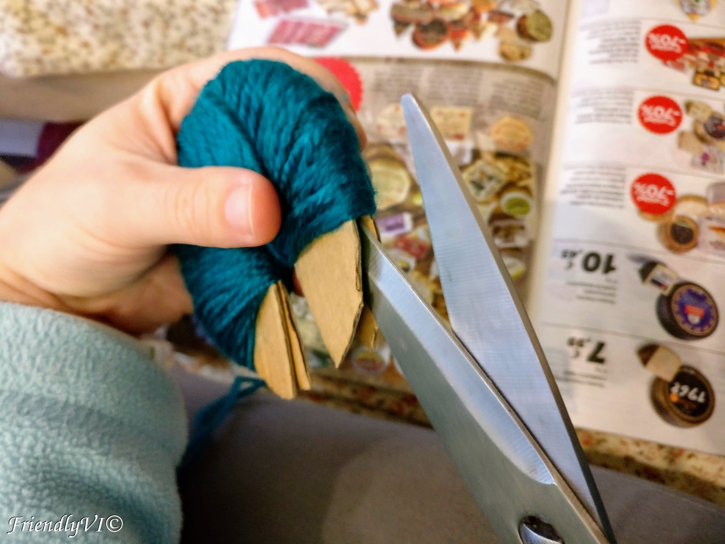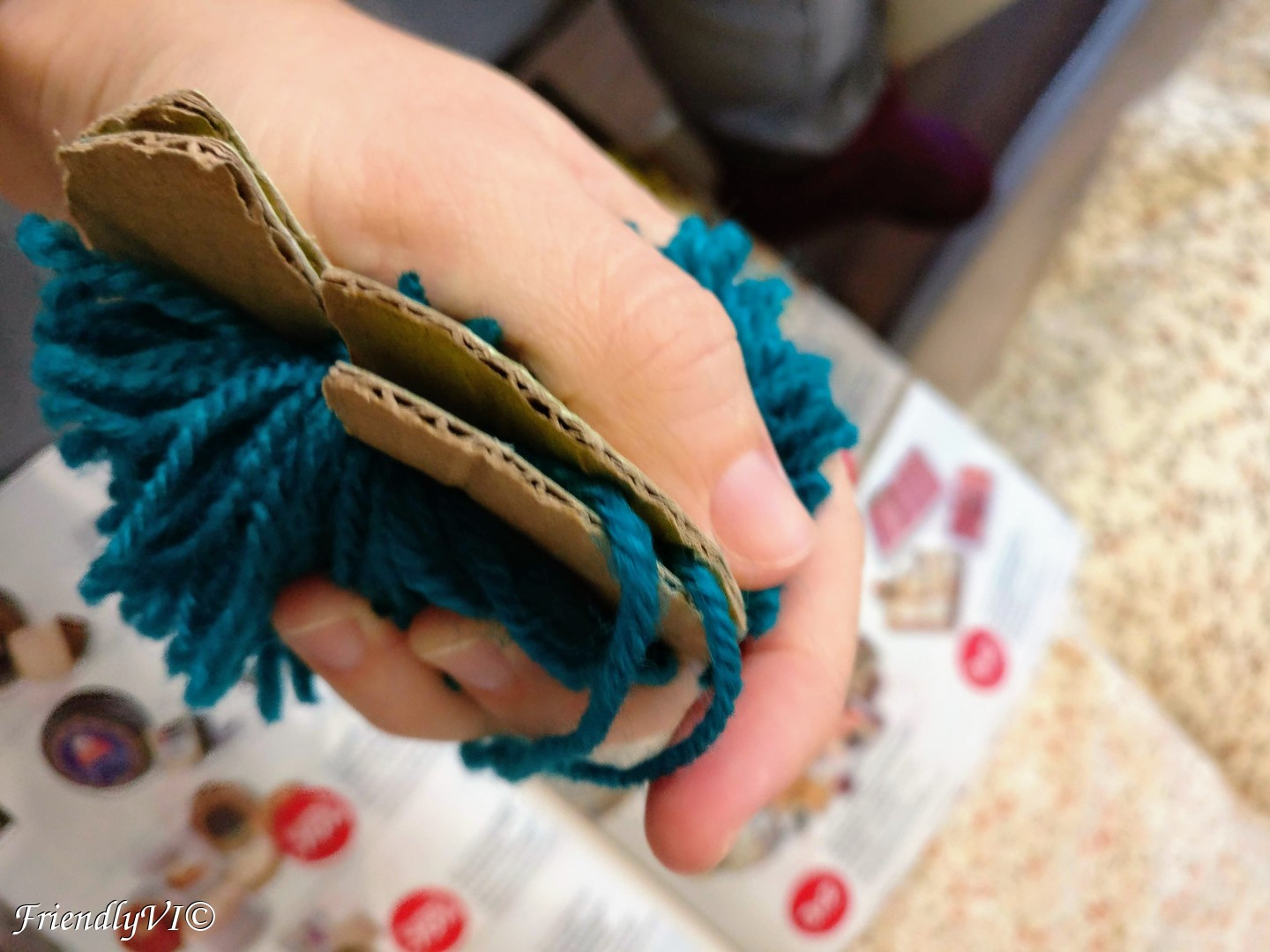 In order to shape it up place on piece of the cardboard on the bottom and the other on the top and start cutting everything that sticks out. Do the same on thing after you flip the pom-pom on the other side.