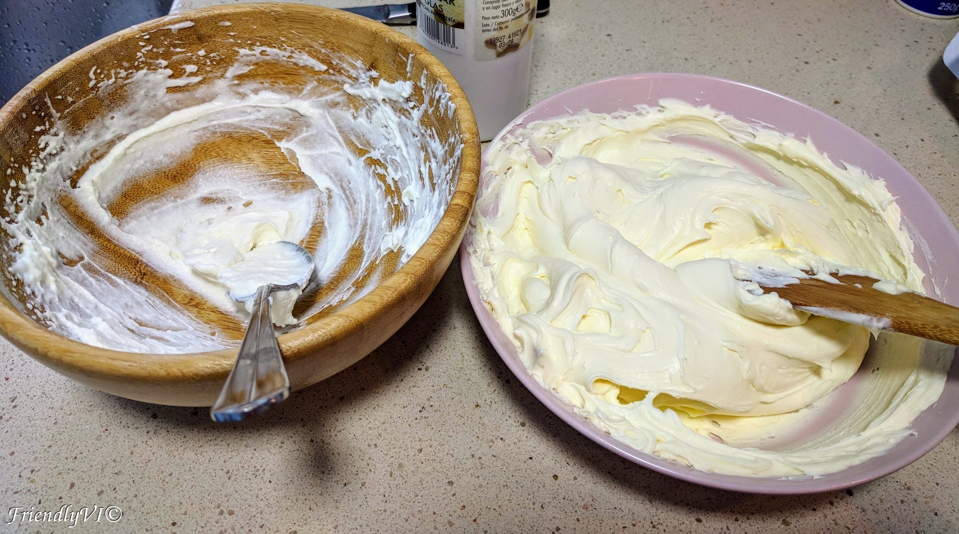 - Mix the mascarpone with the powder sugar and mix in the heavy cream very slowly and with circular moves. Keep a few tbsp of the heavy cream for the final decoration.