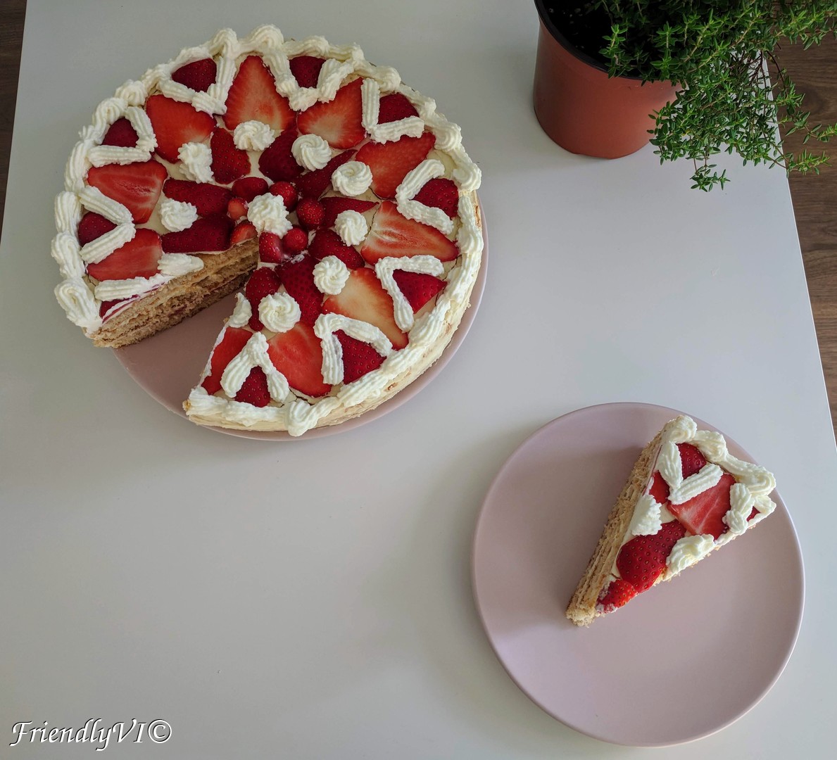 I have to admit that cakes are not my specialty nor my choice for a dessert. But there was this one time I wanted to celebrate a special moment with a huge cake looking very “cake-y”. So I came up with this very fast recipe, that gets better and better with every extra day you wait for the juices to soak in: mascarpone cake with strawberries and baked apple
