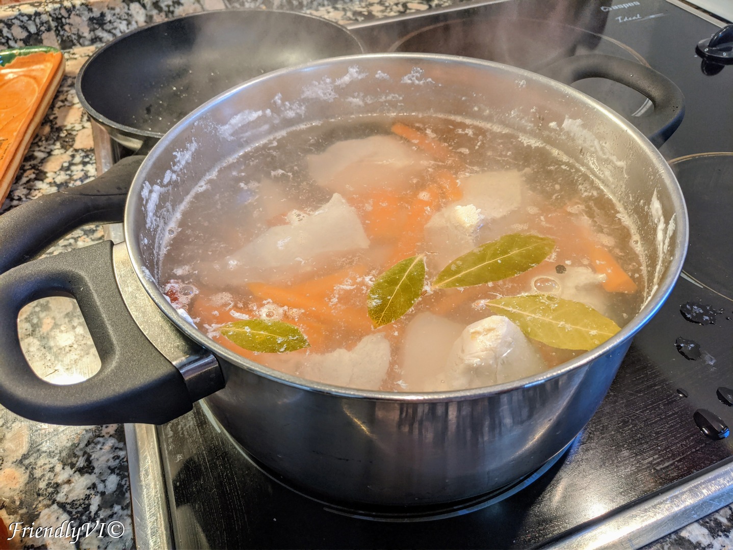 - Chicken version: Start boiling the chicken in a big pot in cold water. After 3-4 min you can add some bay leaves, whole pepper, salt and pepper and carrots if you want to use the broth as an extra chicken soup.