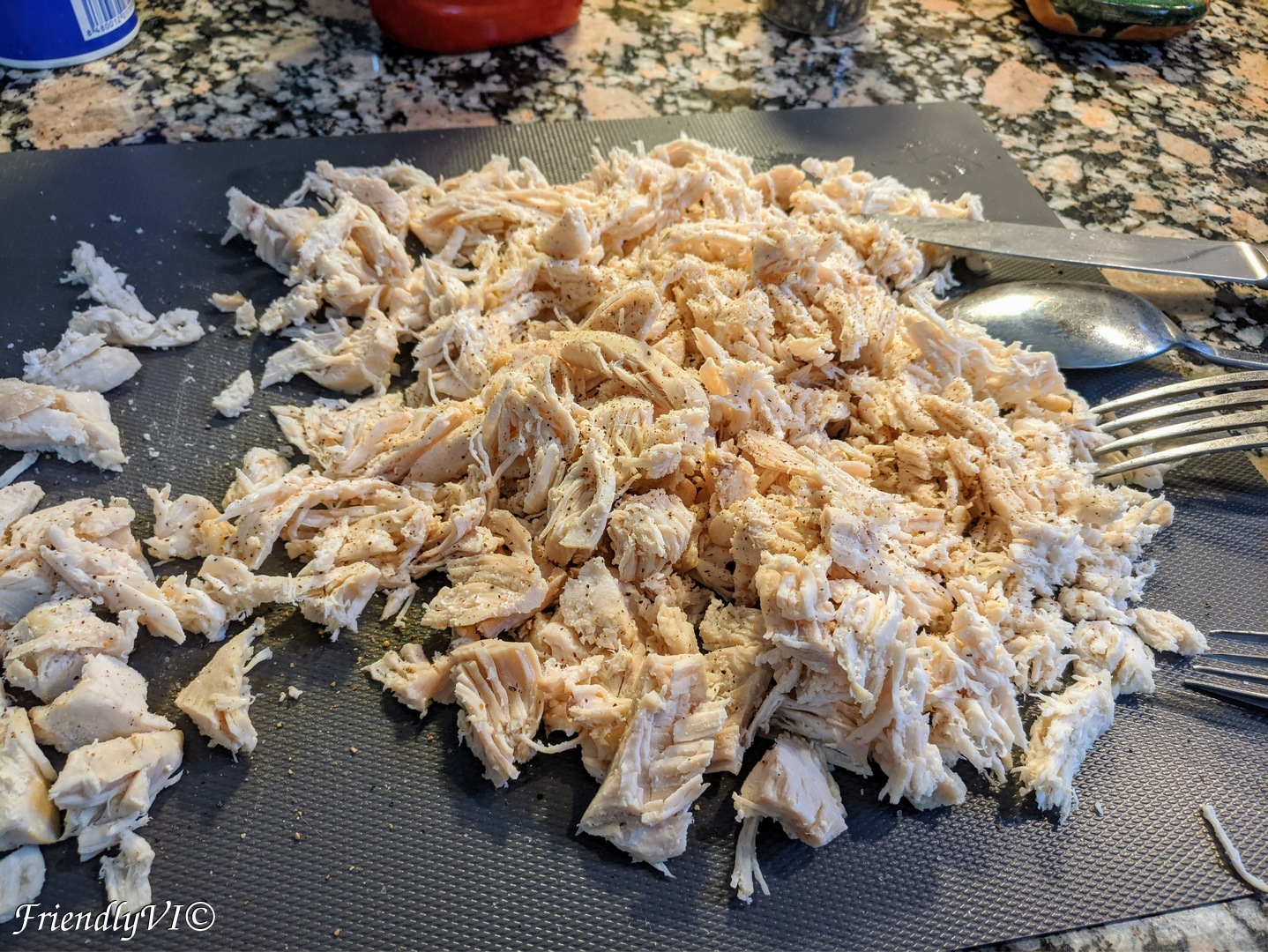 Shred the chicken and season with more salt and pepper if needed. I also add a pinch of ground cumin.