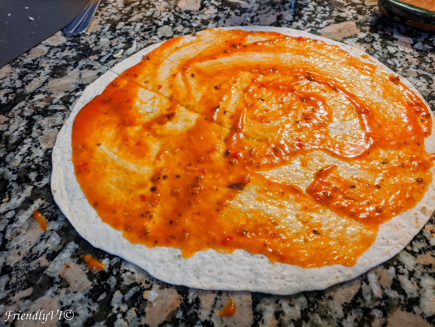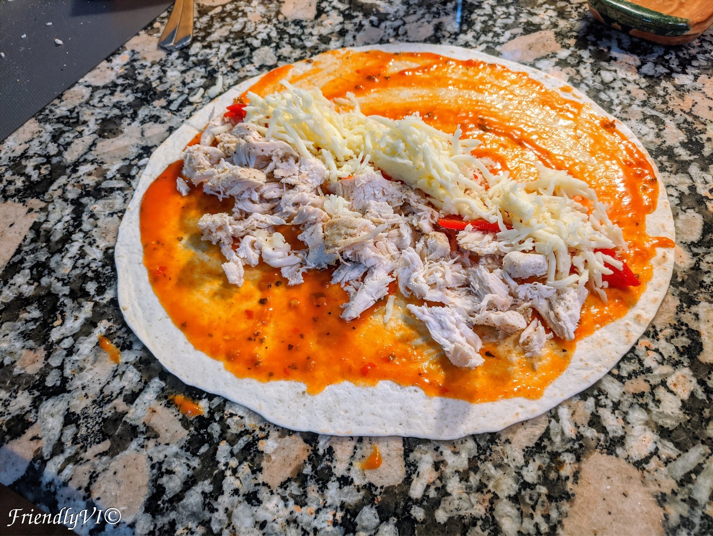 - Put some sauce on the tortilla wrap.
