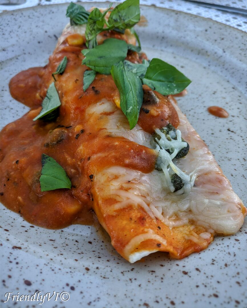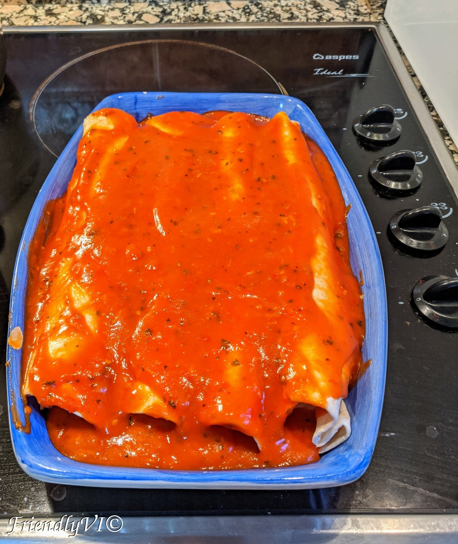 One tip – make the sauce for more portions, but keep it in the fridge and bake only as many enchiladas as you will eat in one go, otherwise they will get soggy.