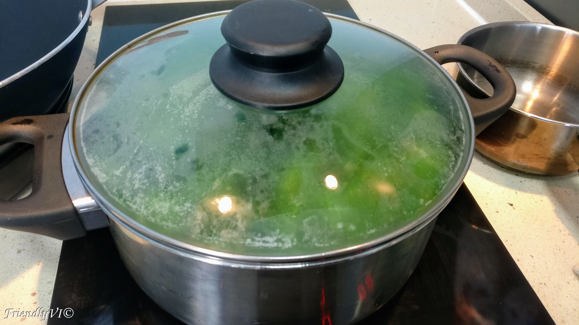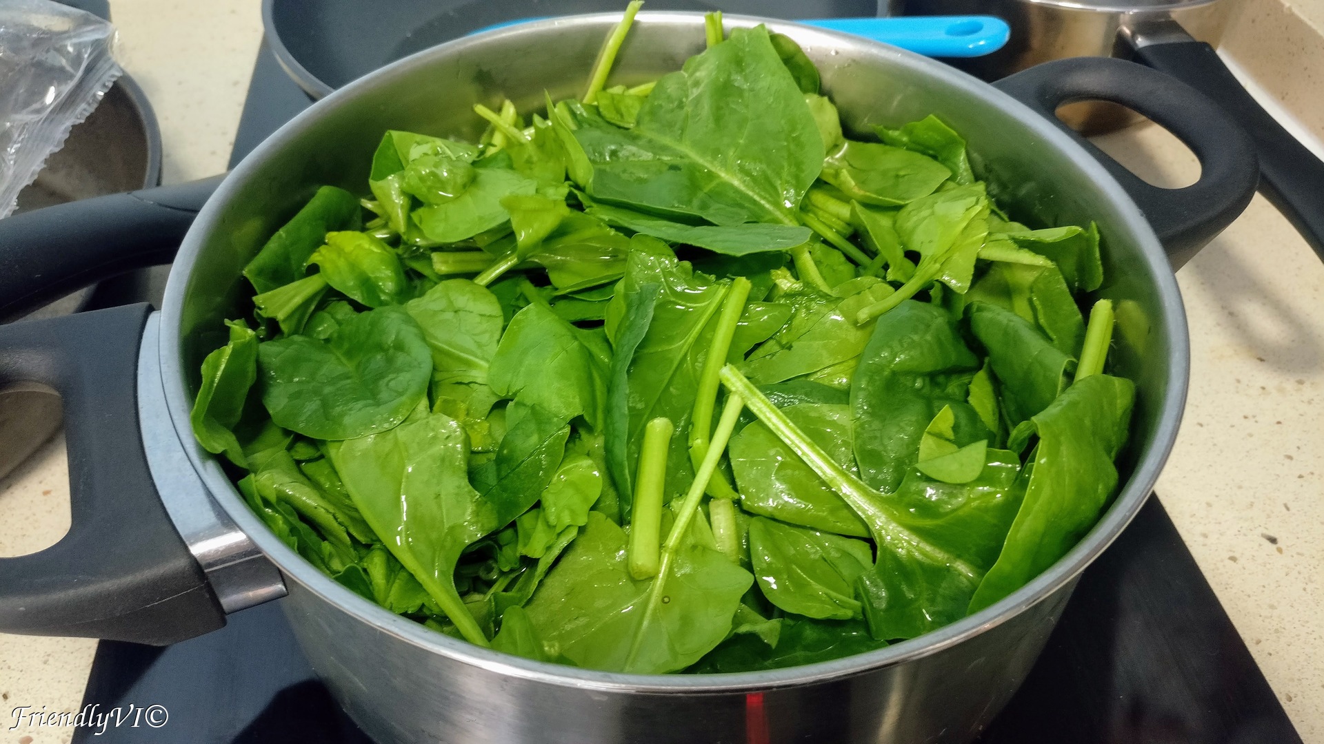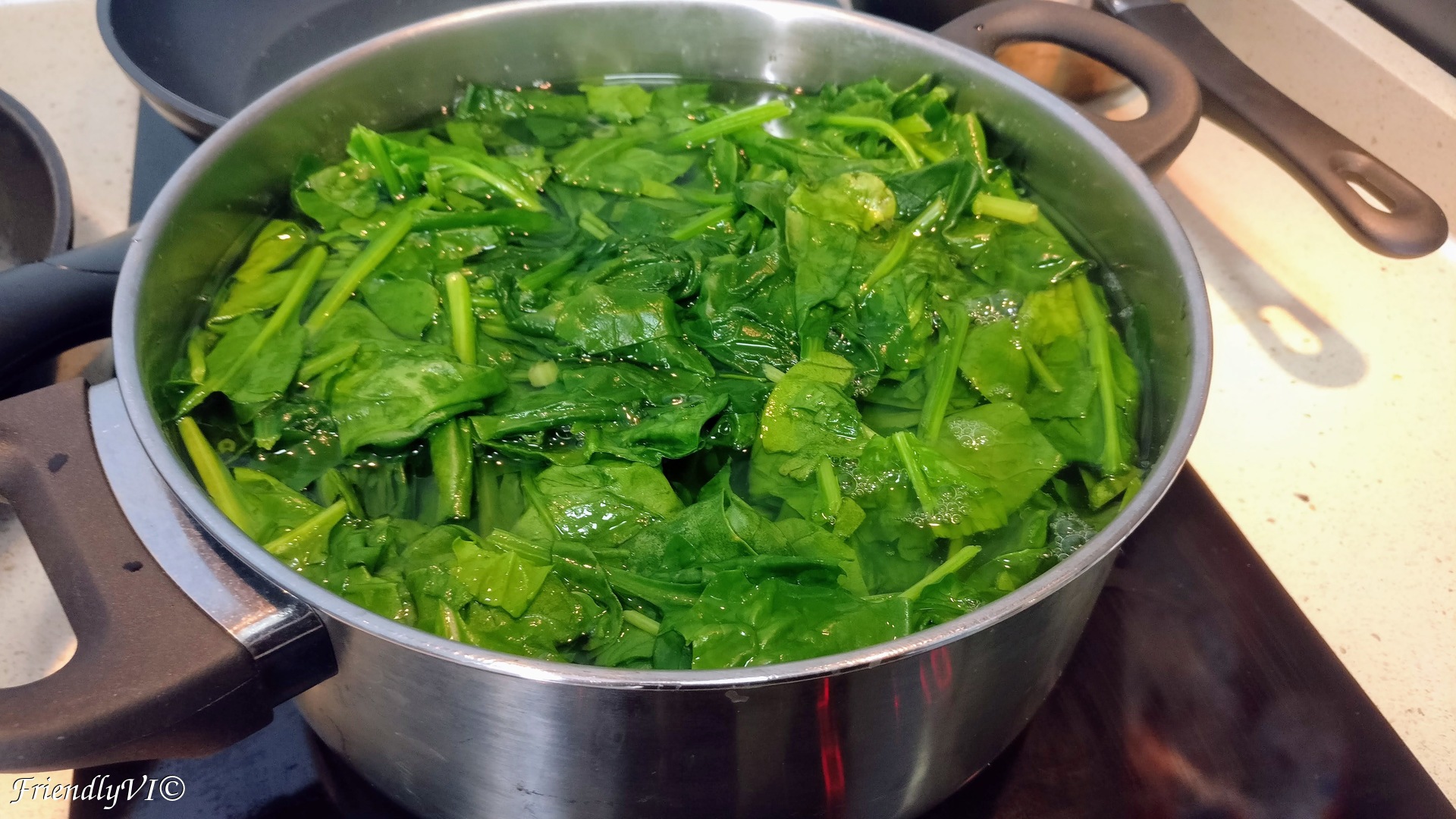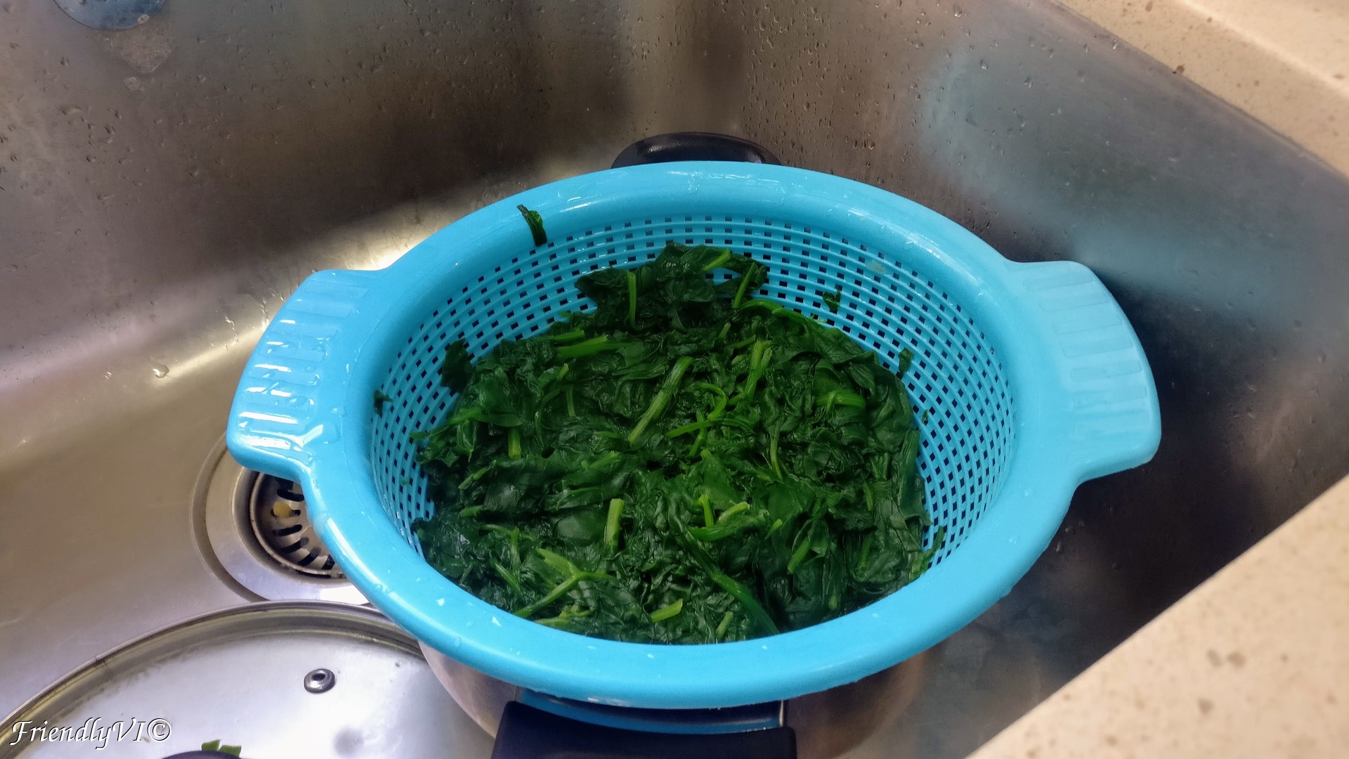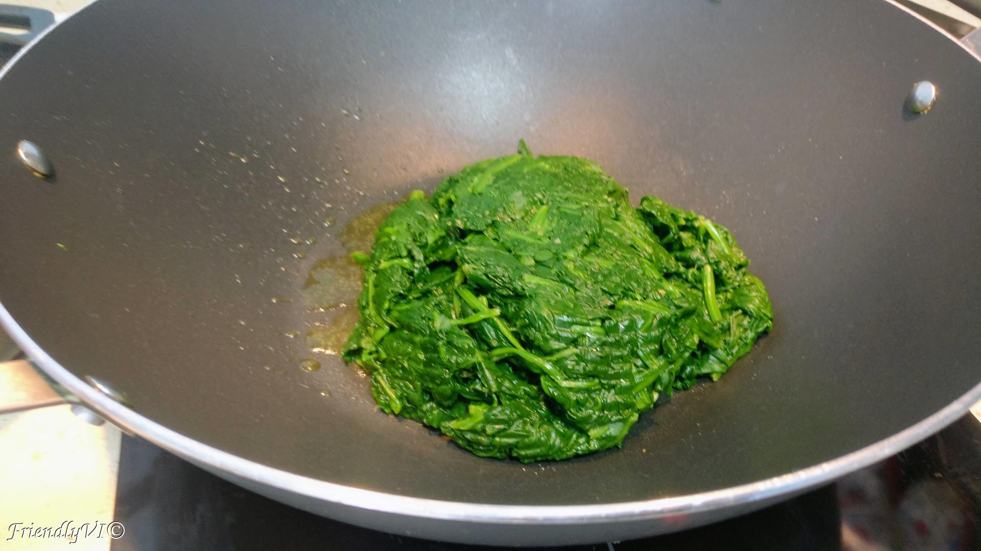 1. In a big pot with water and salt try to fit all your spinach. It has a lot of volume, but it will reduce just in a few min.