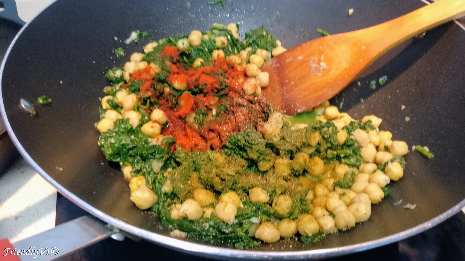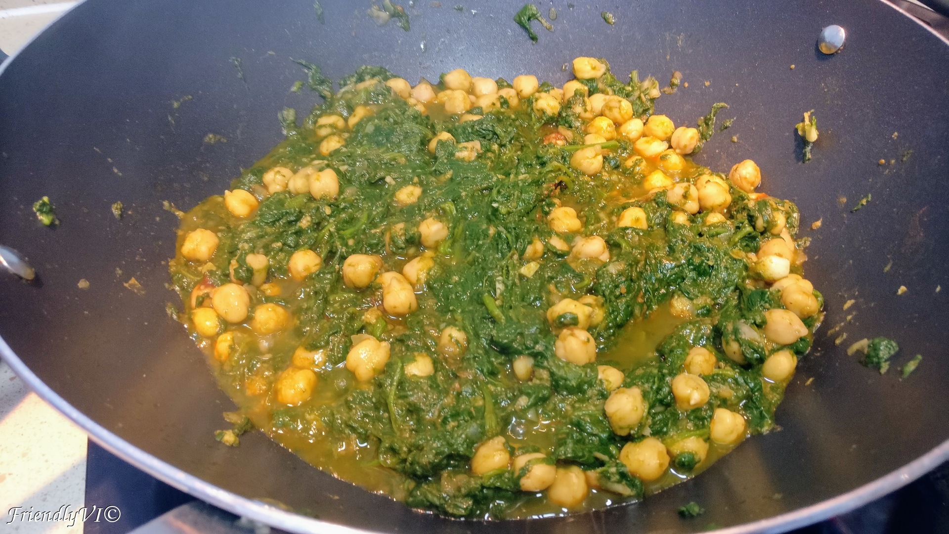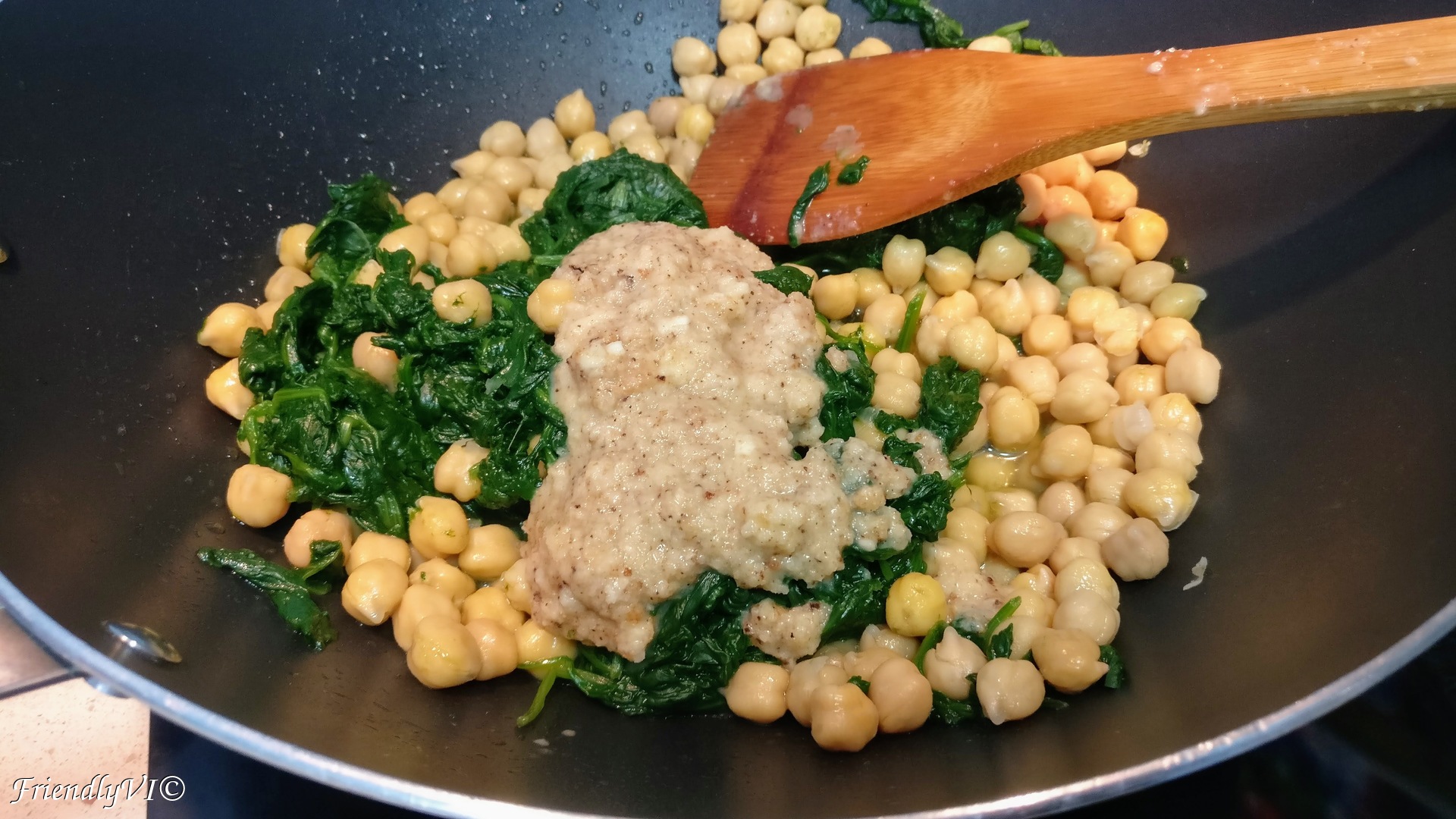 6. In a bit of olive oil put the drained spinach, drained and washed chickpeas and the blended bread mixture.