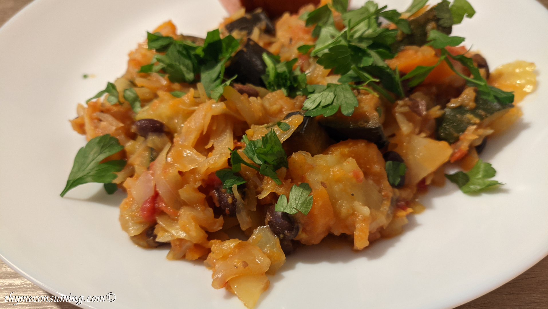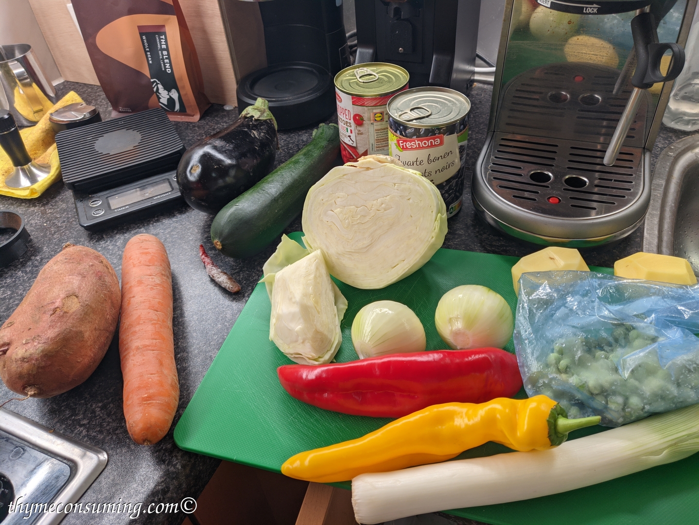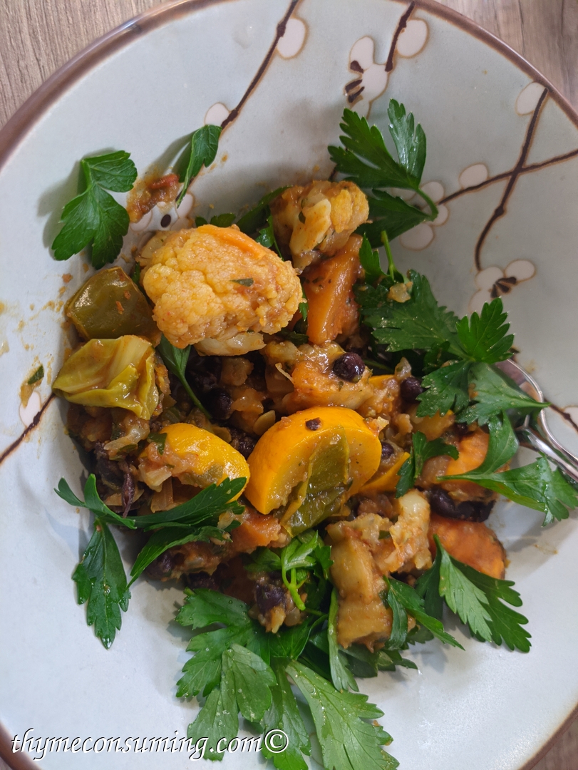- Onion, sweet potato, green pepper, garlic, tomatoes, cauliflower, zucchini, black canned beans, aubergine: