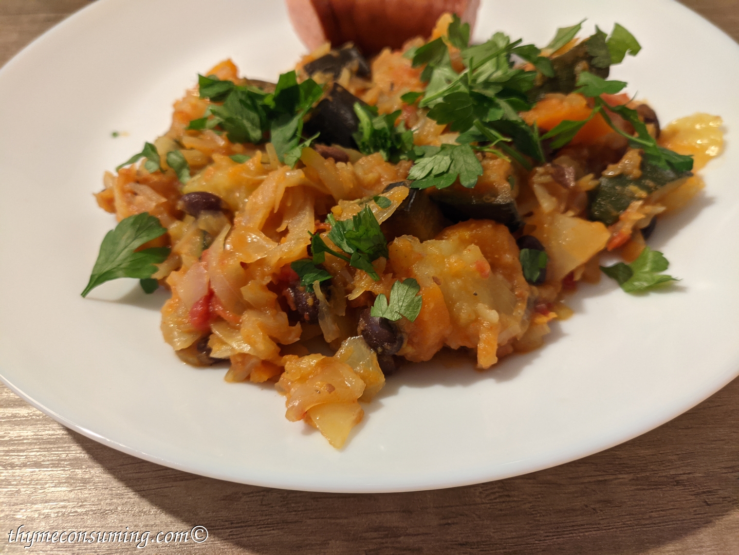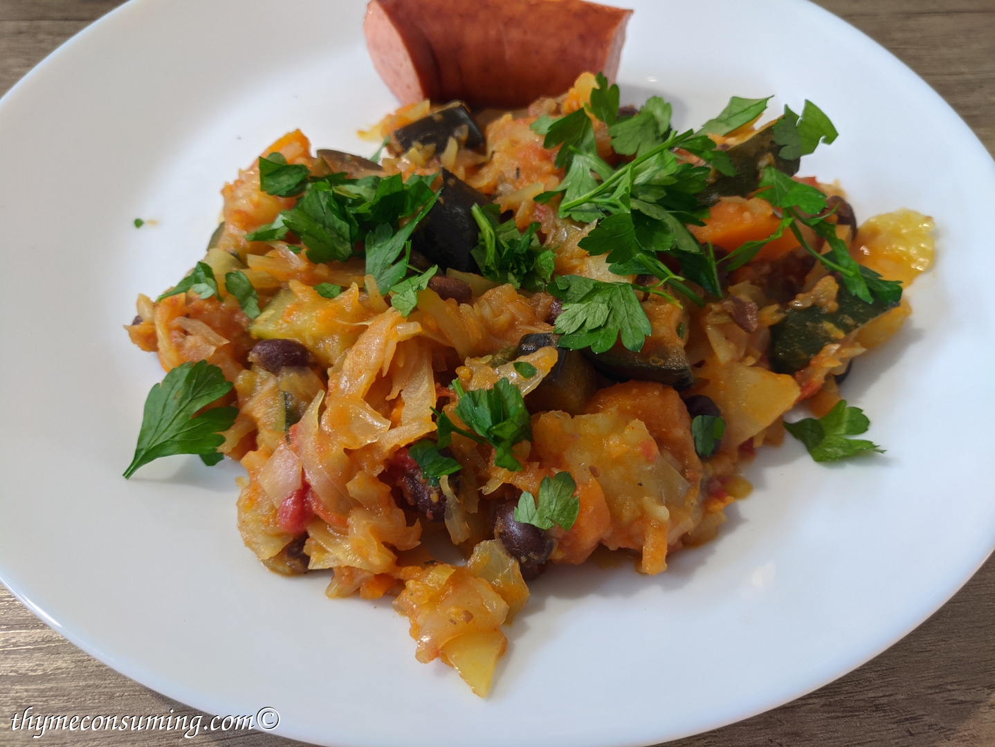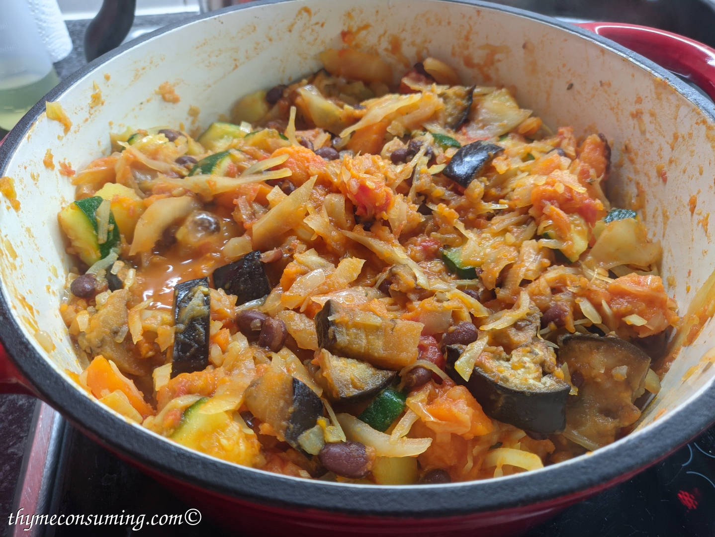 - Onion, sweet potato, green pepper, garlic, tomatoes, cauliflower, zucchini, black canned beans, aubergine:
