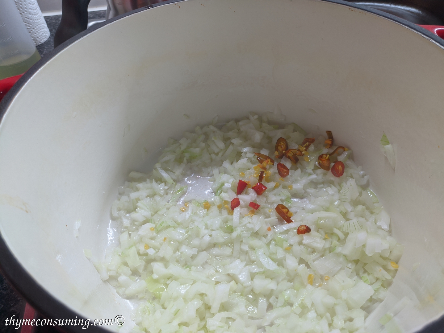 - Saute 2 onions until soft then add the chili peppers.
