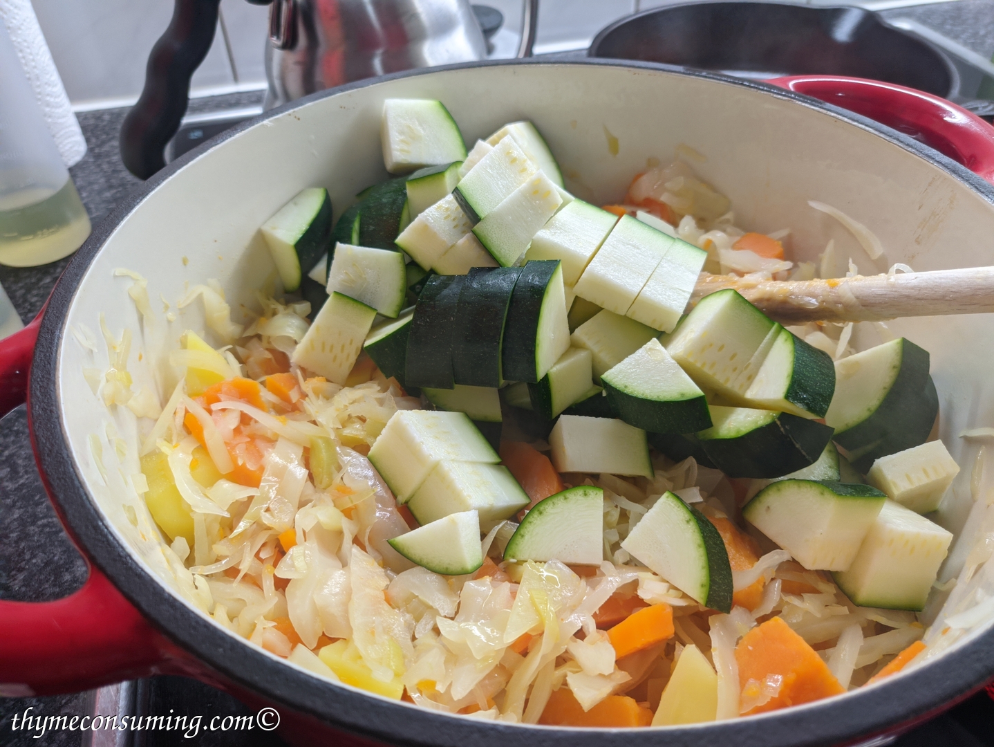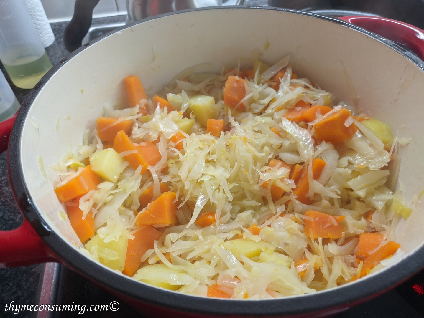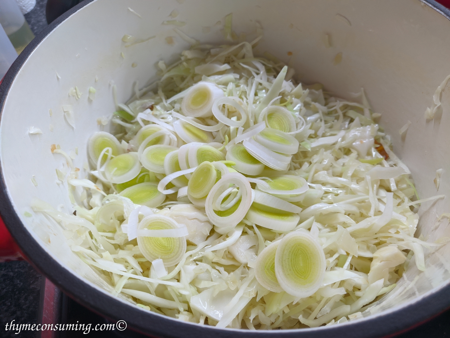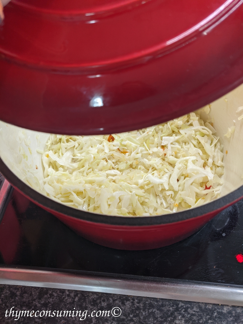 - Add the 1 half of a big cabbage bit by bit until it wilts. Let is cook with the lid on for 10 min.