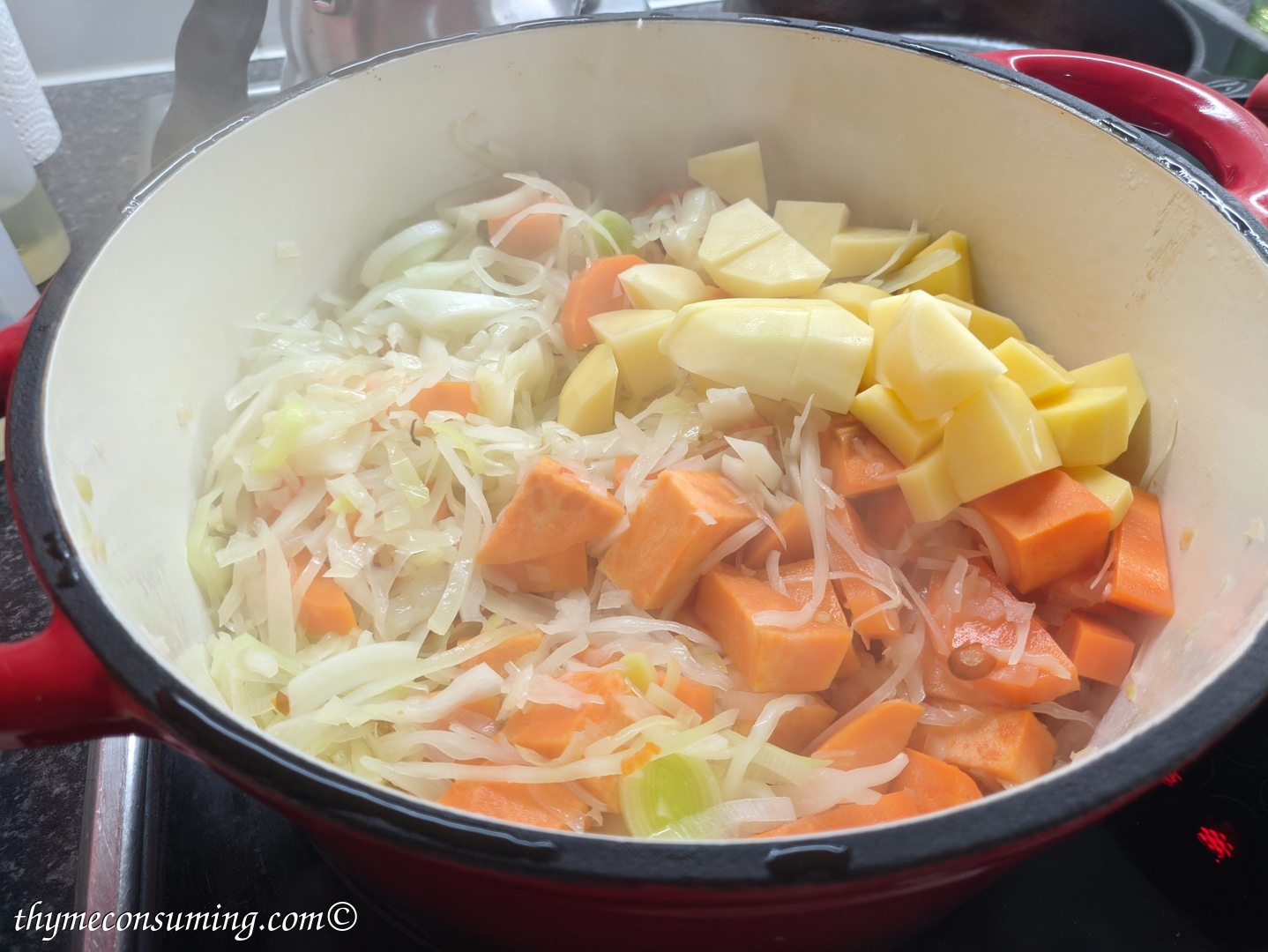 - It is time to add harder veggies so that they have time to soften: sweet potato, carrot, 2 normal potatoes. Let them befriend for like 15 min with the lid on: