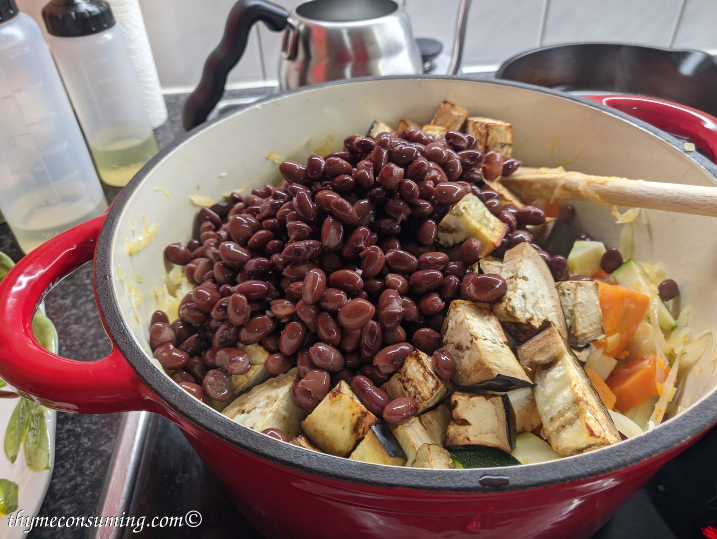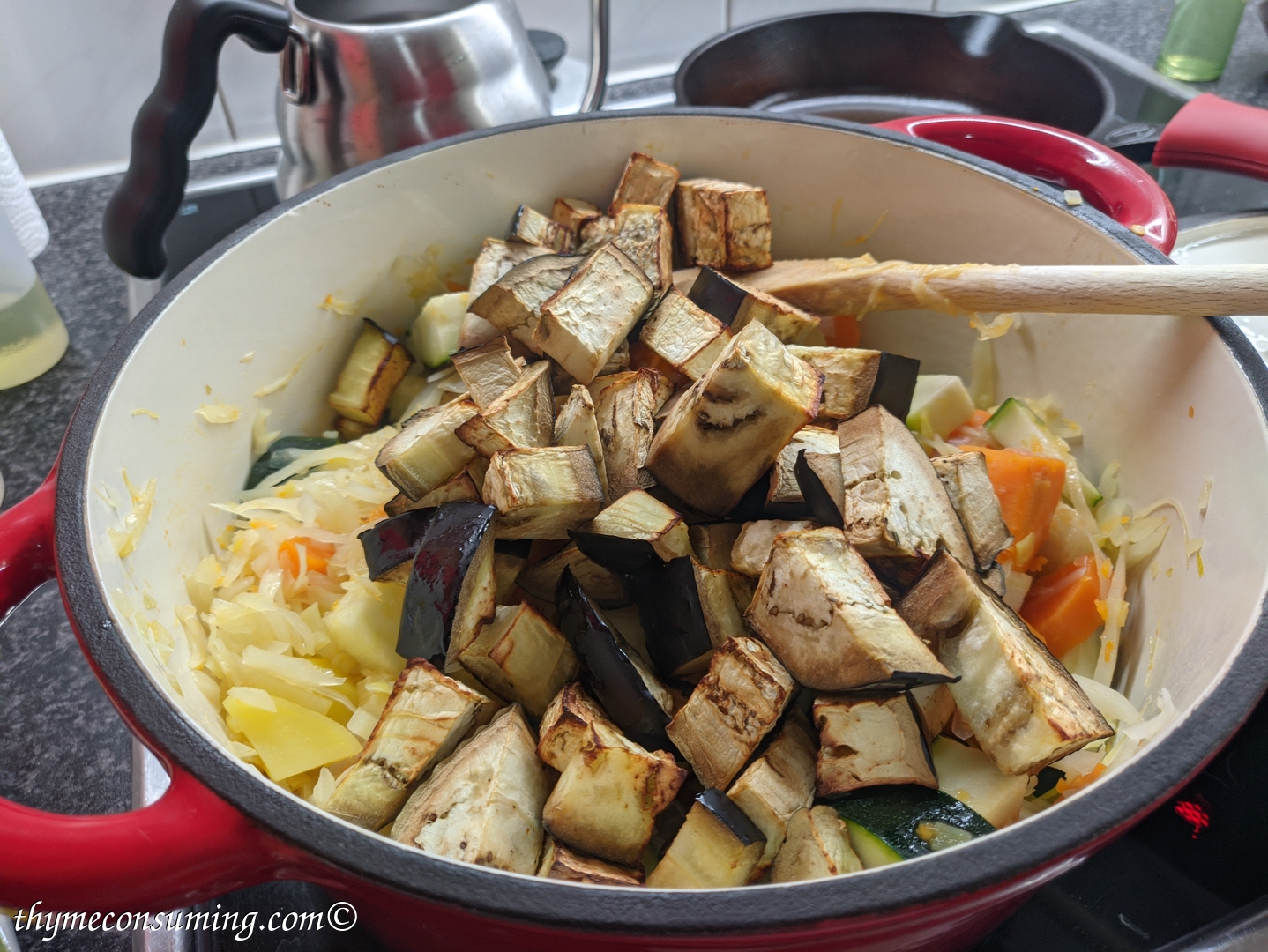 - Add the zucchini and the fried aubergine.